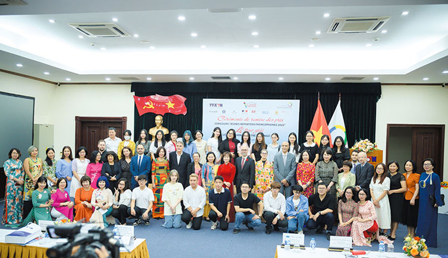 | Các đại biểu và các thí sinh tại lễ trao giải cuộc thi "Phóng viên trẻ Pháp ngữ" lần thứ 7 năm 2022 do báo Le Courrier du Vietnam tổ chức |