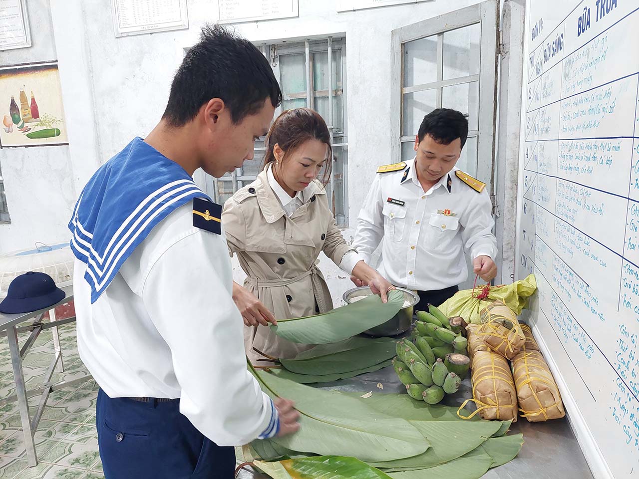 | Phóng viên Yên Khương gói bánh chưng cùng các chiến sĩ Hải quân trên đảo Lý Sơn, tháng 1/2023 |