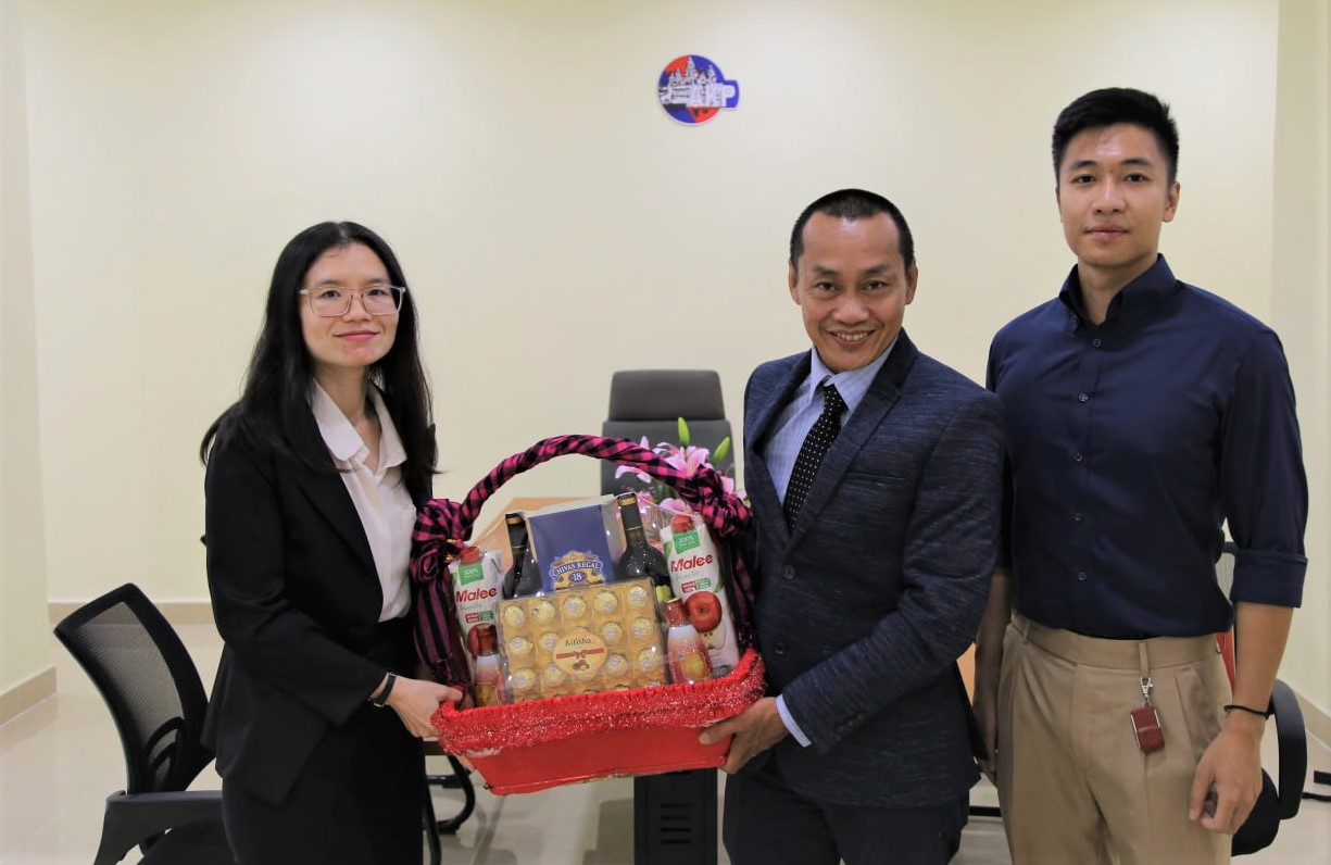 | Trưởng CQTT TTXVN tại Phnom Penh Huỳnh Văn Thảo chúc mừng Tết cổ truyền Tổng giám đốc hãng thông tấn Campuchia AKP Sok Mom Nimul |