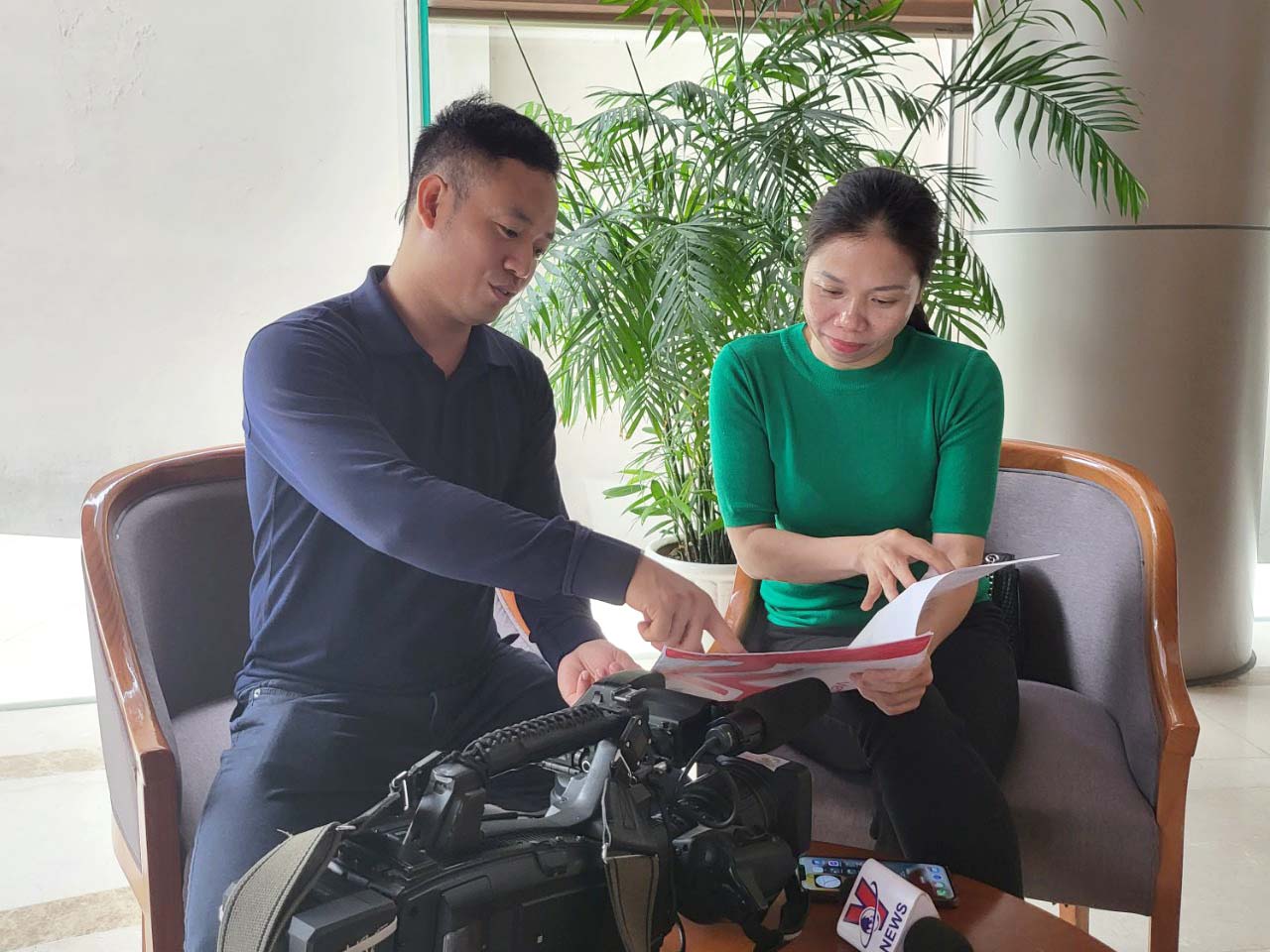 | Quay phim Nguyễn Văn Bình và phóng viên Lưu Thị Thoan trao đổi nội dung kịch bản trước khi đi hiện trường |