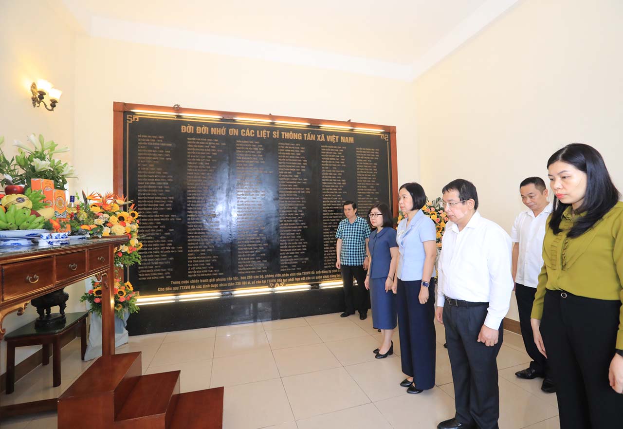 Sự kiện và kỷ niệmTin trong ngành Kỷ niệm 98 năm ngày Báo chí cách mạng Việt Nam (21/6/1925-21/6/2023): Tưởng nhớ các nhà báo liệt sĩ TTXVN Thứ tư, 21/06/2023 11:39 Sáng 21/6, kỷ niệm 98 năm ngày Báo chí cách mạng Việt Nam, Đảng ủy, Ban lãnh đạo ngành đã tổ chức lễ dâng hương tưởng niệm các nhà báo liệt sĩ của Thông tấn xã Việt Nam hy sinh vì độc lập, tự do của Tổ quốc, vì sự nghiệp Thông tấn tại Nhà bia liệt sĩ, Trung tâm Thông tấn quốc gia, Hà Nội. Sáng 21/6, kỷ niệm 98 năm ngày Báo chí cách mạng Việt Nam, Đảng ủy, Ban lãnh đạo ngành đã tổ chức lễ dâng hương tưởng niệm các nhà báo liệt sĩ của Thông tấn xã Việt Nam đã hy sinh vì độc lập, tự do của Tổ quốc, vì sự nghiệp Thông tấn tại Nhà bia liệt sĩ, Trung tâm Thông tấn quốc gia, Hà Nội. Tổng giám đốc TTXVN Vũ Việt Trang cùng các đại biểu tưởng niệm các nhà báo liệt sĩ TTXVN tại Nhà bia liệt sĩ, Trung tâm thông tấn quốc gia, Hà Nội, ngày 21/6 TTXVN/Nội san Thông tấn