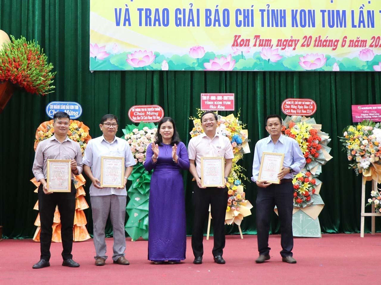| Trưởng CQTT tại Kon Tum Hoàng Cao Nguyên (thứ hai bên phải) nhận giải A Giải báo chí tỉnh Kon Tum, ngày 20/6 |