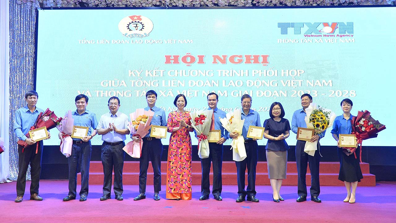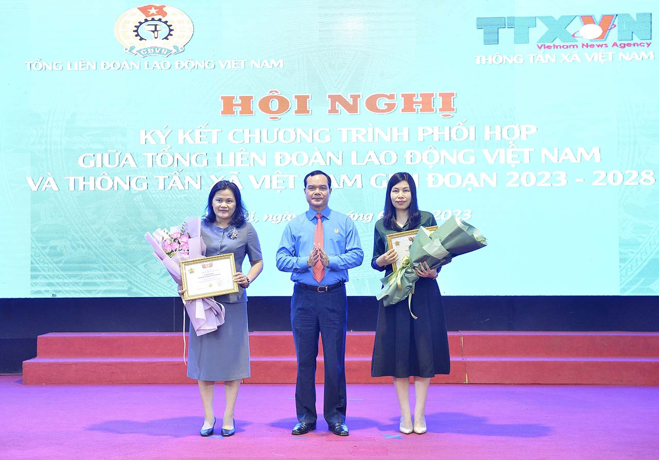 Nhân dịp này, Tổng Liên đoàn Lao động Việt Nam trao Kỷ niệm chương tặng 3 cá nhân và Bằng khen tặng 7 tập thể và cá nhân của TTXVN có thành tích trong triển khai chương trình phối hợp tuyên truyền về phong trào công nhân và hoạt động công đoàn giai đoạn 2017-2022.