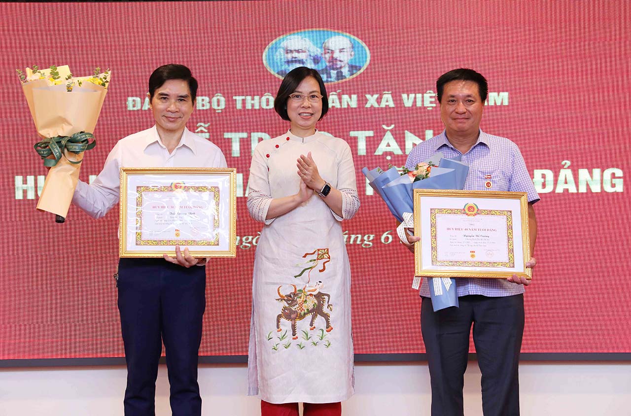 | Đồng chí Vũ Việt Trang, Ủy viên Ban chấp hành Đảng bộ Khối các cơ quan Trung ương, Bí thư Đảng ủy, Tổng giám đốc TTXVN trao Huy hiệu 40 năm tuổi Đảng tặng đồng chí Nguyễn Đỗ Cường (bên phải) và Huy hiệu 30 năm tuổi Đảng tặng đồng chí Trần Quang Vinh |