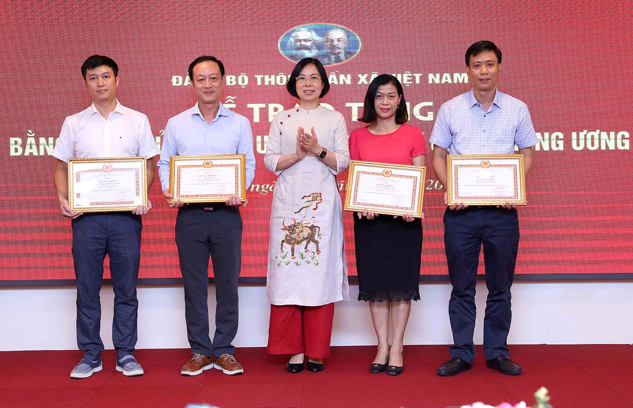 | Đồng chí Vũ Việt Trang, Ủy viên Ban chấp hành Đảng bộ Khối các cơ quan Trung ương, Bí thư Đảng ủy, Tổng giám đốc TTXVN trao Bằng khen của Đảng ủy Khối tặng 4 đảng viên hoàn thành xuất sắc nhiệm vụ giai đoạn 2018 - 2022 |