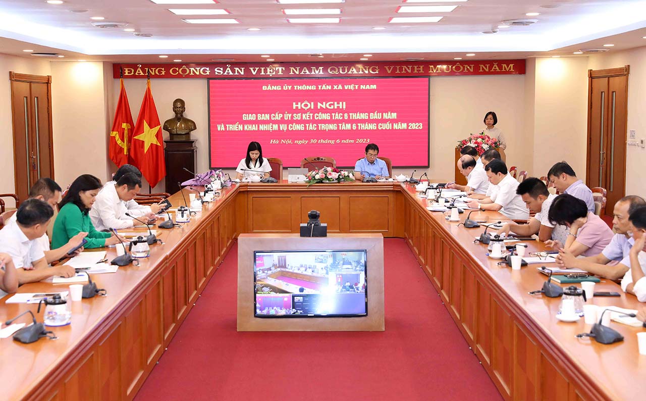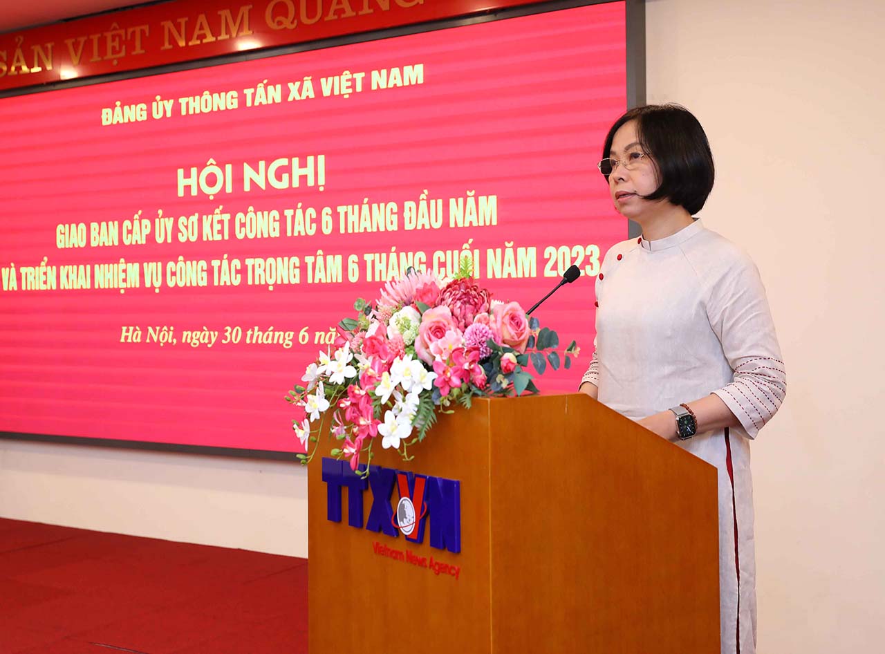 Tại hội nghị, trình bày báo cáo sơ kết công tác Đảng 6 tháng đầu năm, Phó bí thư chuyên trách Đảng ủy Đỗ Thị Trang cho biết: Sáu tháng đầu năm, dưới sự lãnh đạo, chỉ đạo của Đảng ủy và Ban lãnh đạo TTXVN, toàn ngành đã nỗ lực hoàn thành tốt mọi nhiệm vụ chính trị được giao, giữ vững dòng thông tin thông tấn chủ lực, có tính định hướng cao. Tư tưởng cán bộ, đảng viên ổn định, tuyệt đối tin tưởng vào sự lãnh đạo, chỉ đạo của Đảng, Nhà nước, của ngành, quyết tâm hoàn thành tốt các chỉ tiêu, kế hoạch đã đề ra trong năm 2023.