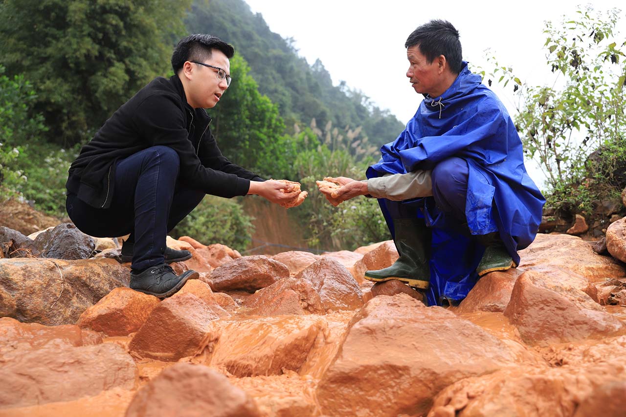 | Phóng viên Võ Mạnh Hùng (trái), báo điện tử VietnamPlus, tìm hiểu hoạt động khai thác khoáng sản xả thẳng nước thải ra môi trường trên địa bàn xã Châu Hồng, huyện Quỳ Hợp, tỉnh Nghệ An, tháng 12/2022 |