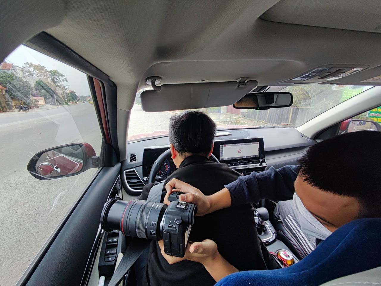 | Phóng viên Võ Mạnh Hùng vừa lái xe, vừa lấy lưng làm điểm tựa để phóng viên Hoàng Đạt, báo điện tử VietnamPlus, ghi hình tình trạng ô nhiễm tại huyện Yên Định, tỉnh Thanh Hóa, tháng 12/2022 |