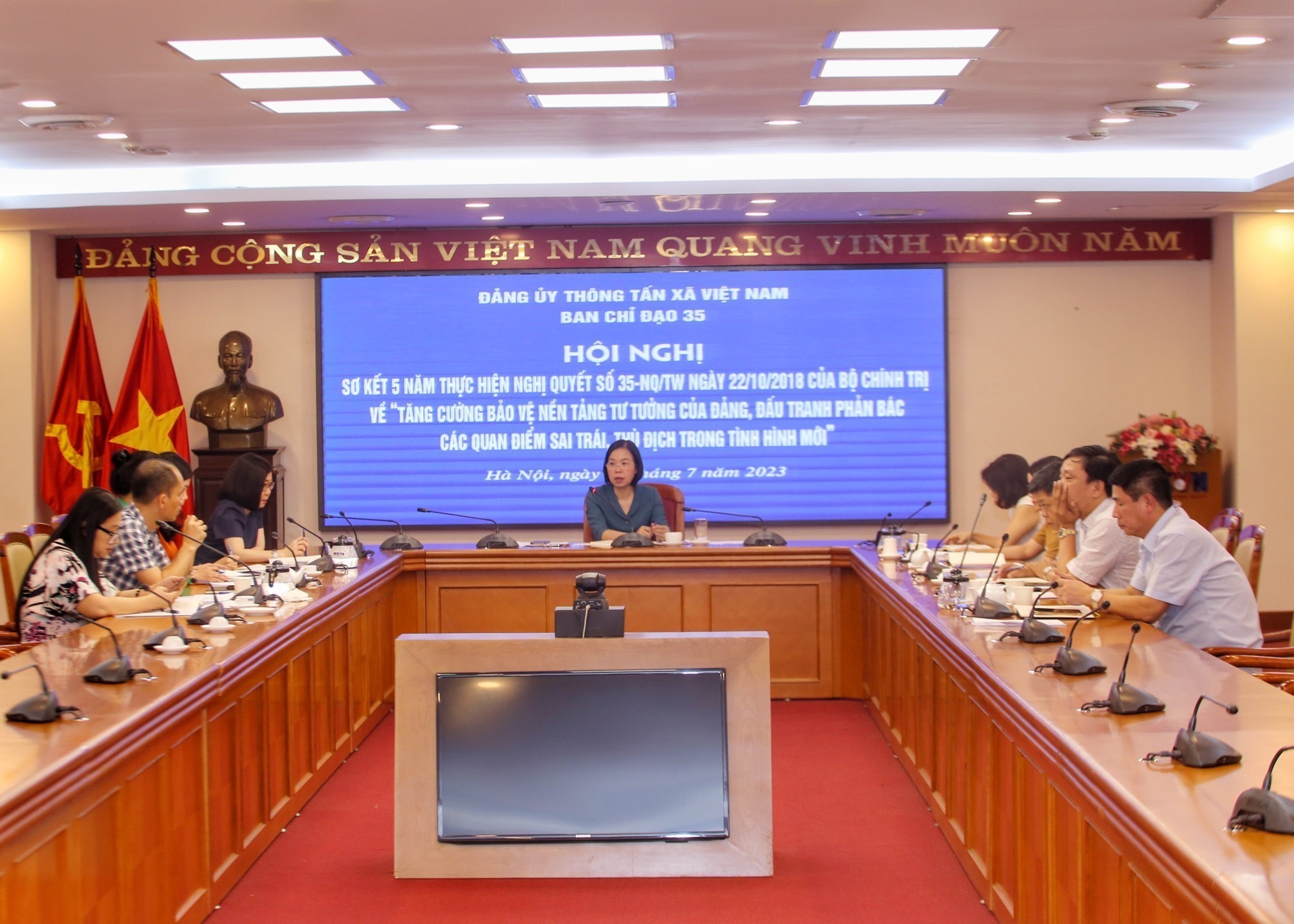 Chiều 25/7, tại Trung tâm Thông tấn quốc gia, Ban chỉ đạo 35 Thông tấn xã Việt Nam (TTXVN) tổ chức Hội nghị sơ kết 5 năm triển khai thực hiện Nghị quyết số 35-NQ/TW, ngày 22/10/2018, của Bộ Chính trị về “Tăng cường bảo vệ nền tảng tư tưởng của Đảng, đấu tranh, phản bác các quan điểm sai trái, thù địch trong tình hình mới”.