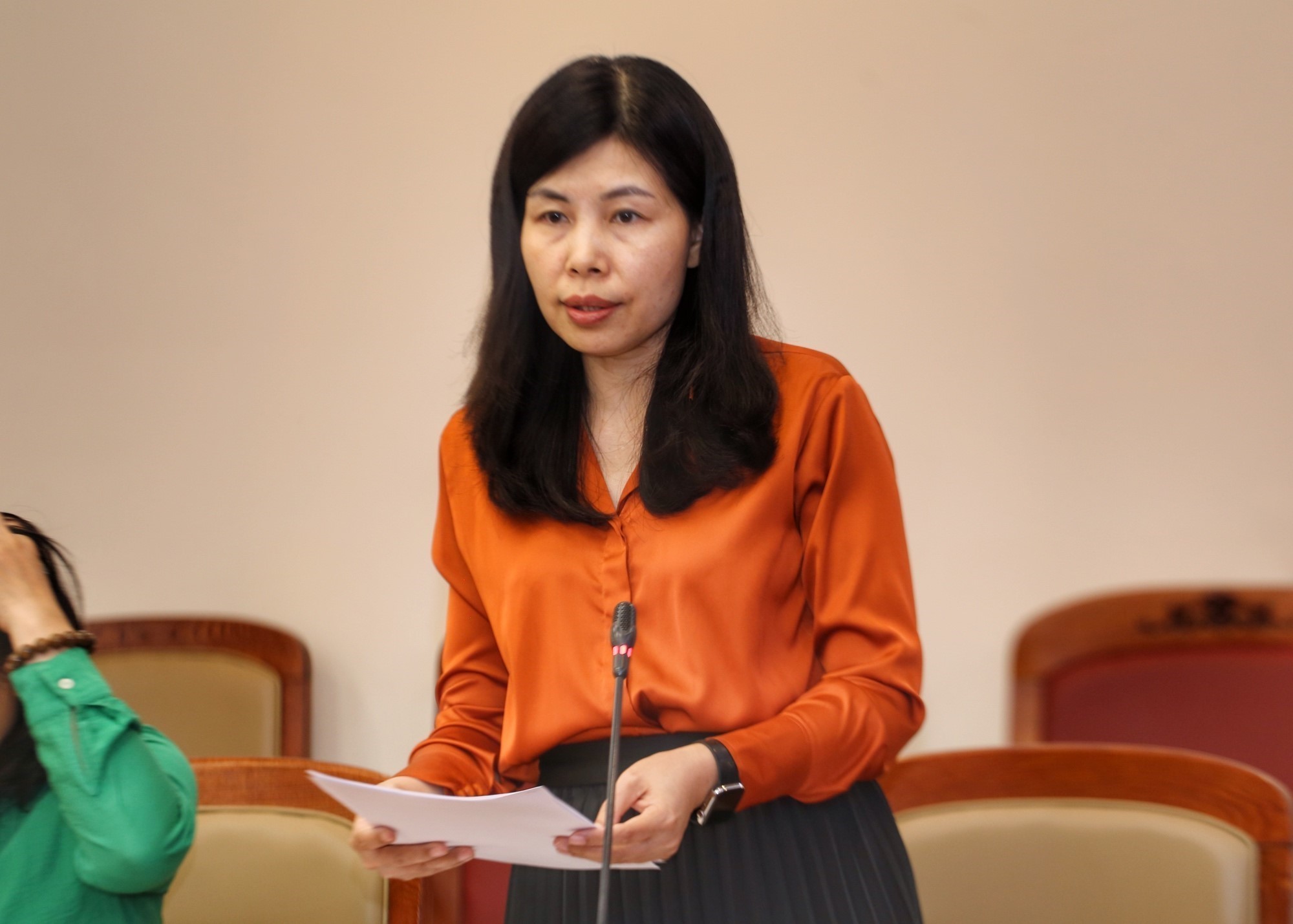 | Đồng chí Đỗ Thị Trang, Phó bí thư Chuyên trách Đảng ủy, Phó trưởng ban thường trực Ban chỉ đạo 35 TTXVN báo cáo sơ kết 5 năm thực hiện Nghị quyết số 35-NQ/TW của Bộ chính trị, ngày 25/7 |