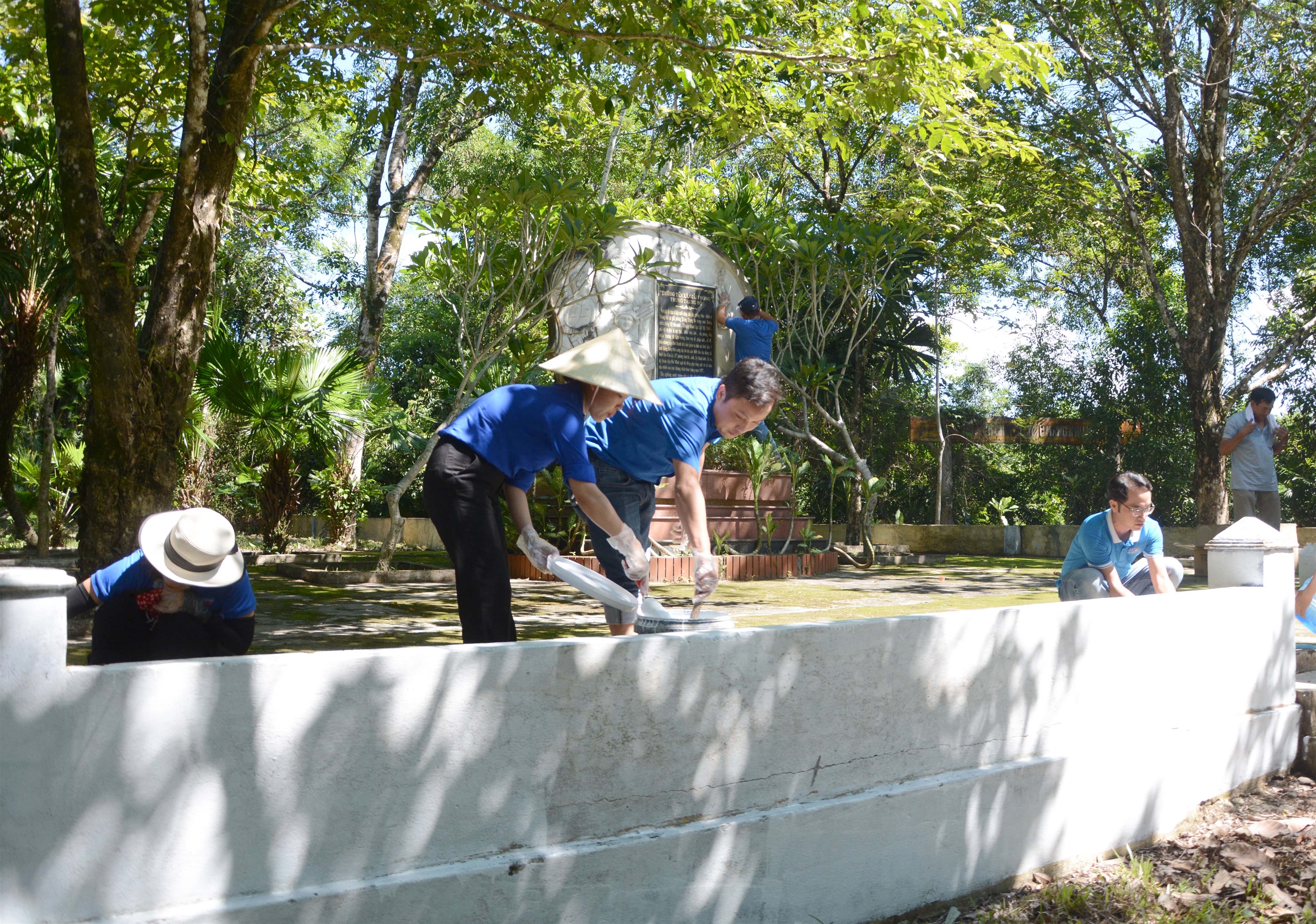 Nhổ cỏ, tưới cây, sơn tường rào bao quanh Bia tưởng niệm liệt sĩ Thông tấn xã Giải phóng Trung Trung bộ, thuộc Khu di tích căn cứ Khu ủy V, xã Sông Trà, huyện Hiệp Đức, tỉnh Quảng Nam, ngày 24/7