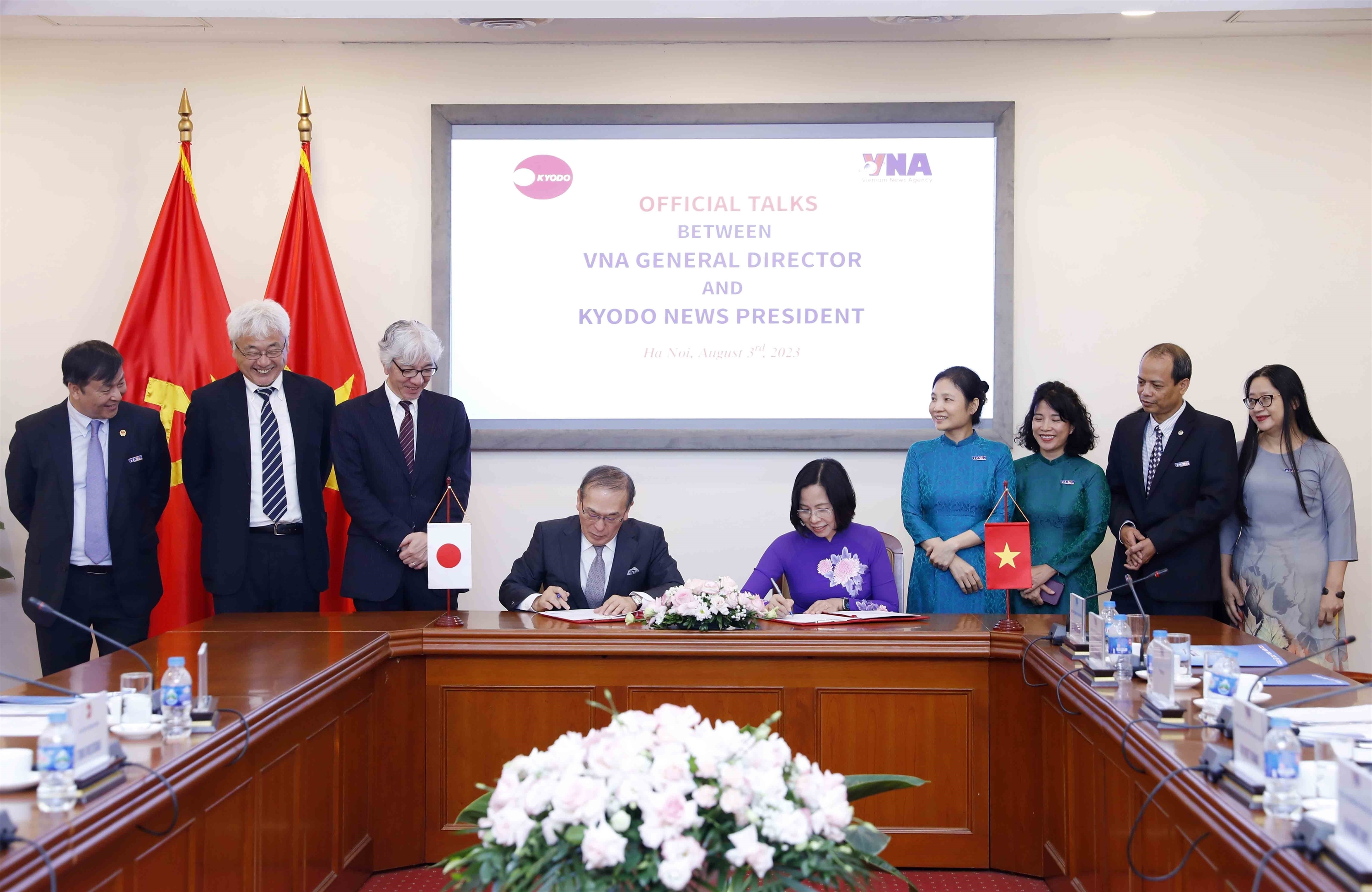 | Tổng giám đốc TTXVN Vũ Việt Trang và Chủ tịch hãng thông tấn Kyodo News (Nhật Bản) Toru Mizutani ký Thỏa thuận hợp tác giữa TTXVN và Kyodo News, ngày 3/8 |