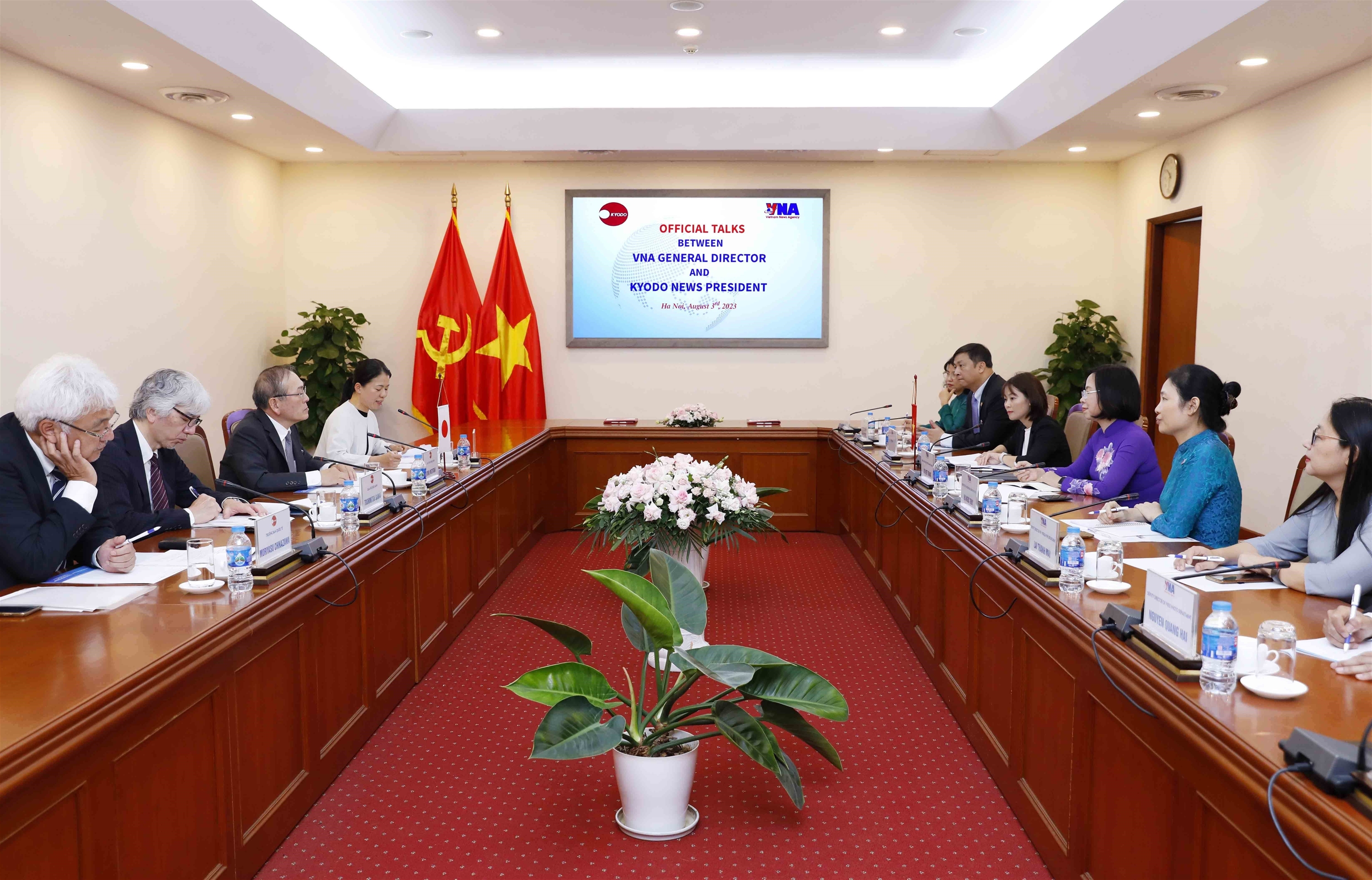 | Quang cảnh cuộc hội đàm giữa đoàn đại biểu TTXVN do Tổng giám đốc Vũ Việt Trang dẫn đầu với đoàn đại biểu Kyodo News do Chủ tịch Toru Mizutani làm Trưởng đoàn, ngày 3/8 |