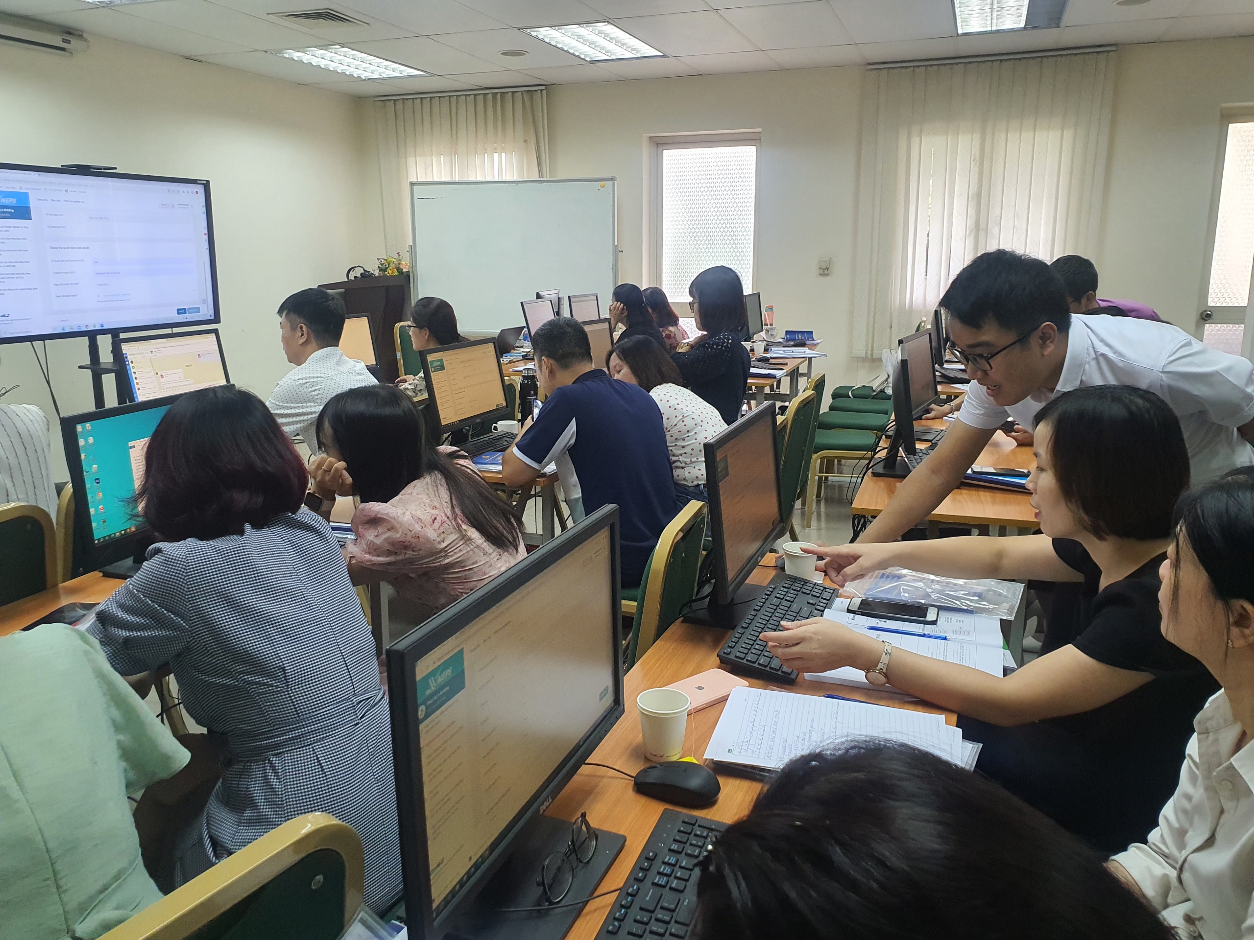 Giảng viên Trung tâm Hỗ trợ đấu thầu, Cục Quản lý đấu thầu thuộc Bộ Kế hoạch và Đầu tư hướng dẫn các học viên thực hành thao tác các bước trong quy trình đấu thầu, đăng tải hồ sơ thầu trên mạng