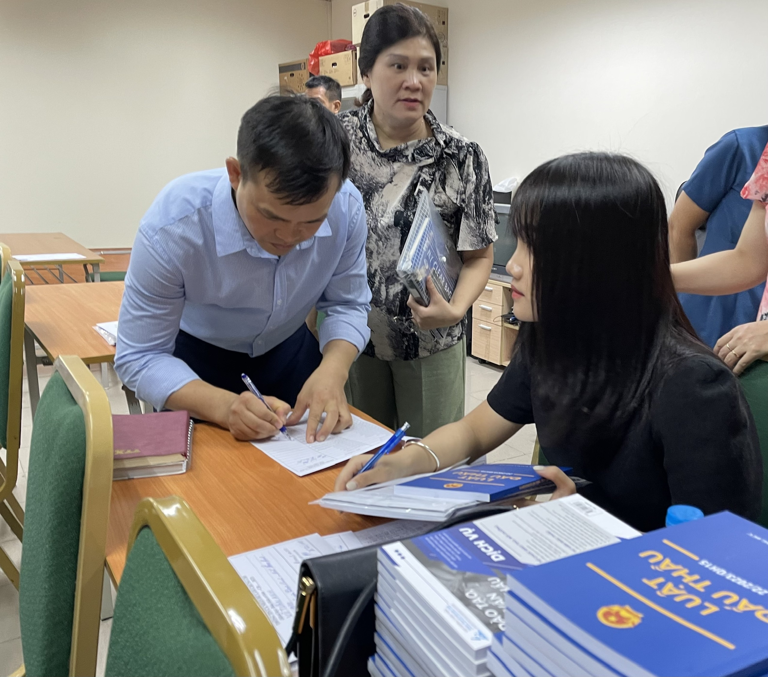 Các học viên nhận tài liệu khóa đào tạo đấu thầu cơ bản và đấu thầu qua mạng