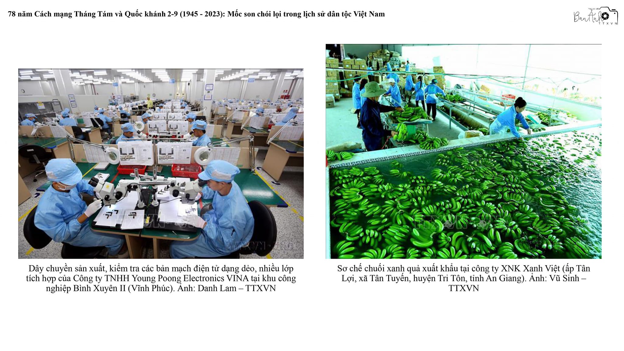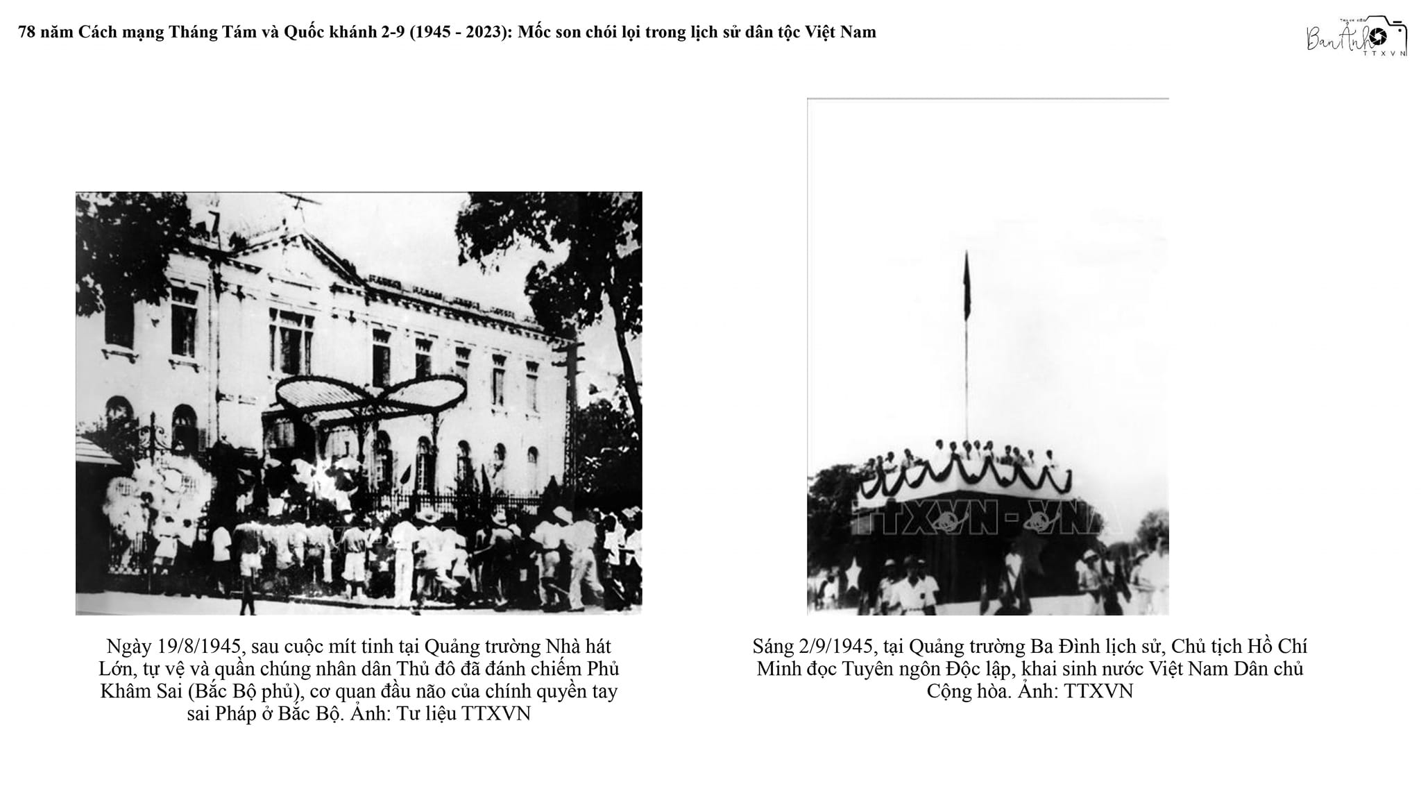 Sự kiện và kỷ niệmTin trong ngành Trưng bày ảnh trực tuyến chào mừng Cách mạng Tháng Tám và Quốc khánh 2/9 Thứ sáu, 25/08/2023 16:08 Ngày 19/8, nhân kỷ niệm 78 năm Cách mạng Tháng Tám (19/8/1945-19/8/2023) và Quốc khánh 2/9, Chi đoàn Ban biên tập Ảnh - Thông tấn xã Việt Nam (TTXVN) đã thực hiện trưng bày ảnh trực tuyến với chủ đề “Mốc son chói lọi trong lịch sử dân tộc Việt Nam”. Chi đoàn đã chọn giới thiệu 43 bức ảnh tư liệu tiêu biểu của TTXVN, phản ánh sự lãnh đạo tài tình, sáng suốt của Đảng, sự vận dụng sáng tạo cùng những bài học kinh nghiệm từ thắng lợi của Cách mạng Tháng Tám trong sự nghiệp đấu tranh giải phóng dân tộc, thống nhất đất nước; những thành tựu to lớn, có ý nghĩa lịch sử trong gần 40 năm thực hiện đường lối đổi mới đất nước của toàn Đảng, toàn dân và toàn quân ta trong sự nghiệp xây dựng và bảo vệ Tổ quốc. Một số tác phẩm trong trưng bày ảnh trực tuyến với chủ đề “Mốc son chói lọi trong lịch sử dân tộc Việt Nam” do Chi đoàn Ban biên tập Ảnh TTXVN thực hiện Trưng bày ảnh trực tuyến góp phần tuyên truyền, giáo dục thế hệ trẻ TTXVN về tầm vóc vĩ đại và giá trị lịch sử to lớn của Cách mạng Tháng Tám, khơi dậy lòng yêu nước, niềm tự hào dân tộc, đồng thời thiết thực ứng dụng công nghệ số, chuyển đổi số trong công tác tuyên truyền, giáo dục cho thanh niên./. Một số tác phẩm trong trưng bày ảnh trực tuyến với chủ đề “Mốc son chói lọi trong lịch sử dân tộc Việt Nam” do Chi đoàn Ban biên tập Ảnh TTXVN thực hiện Nội san Thông tấn