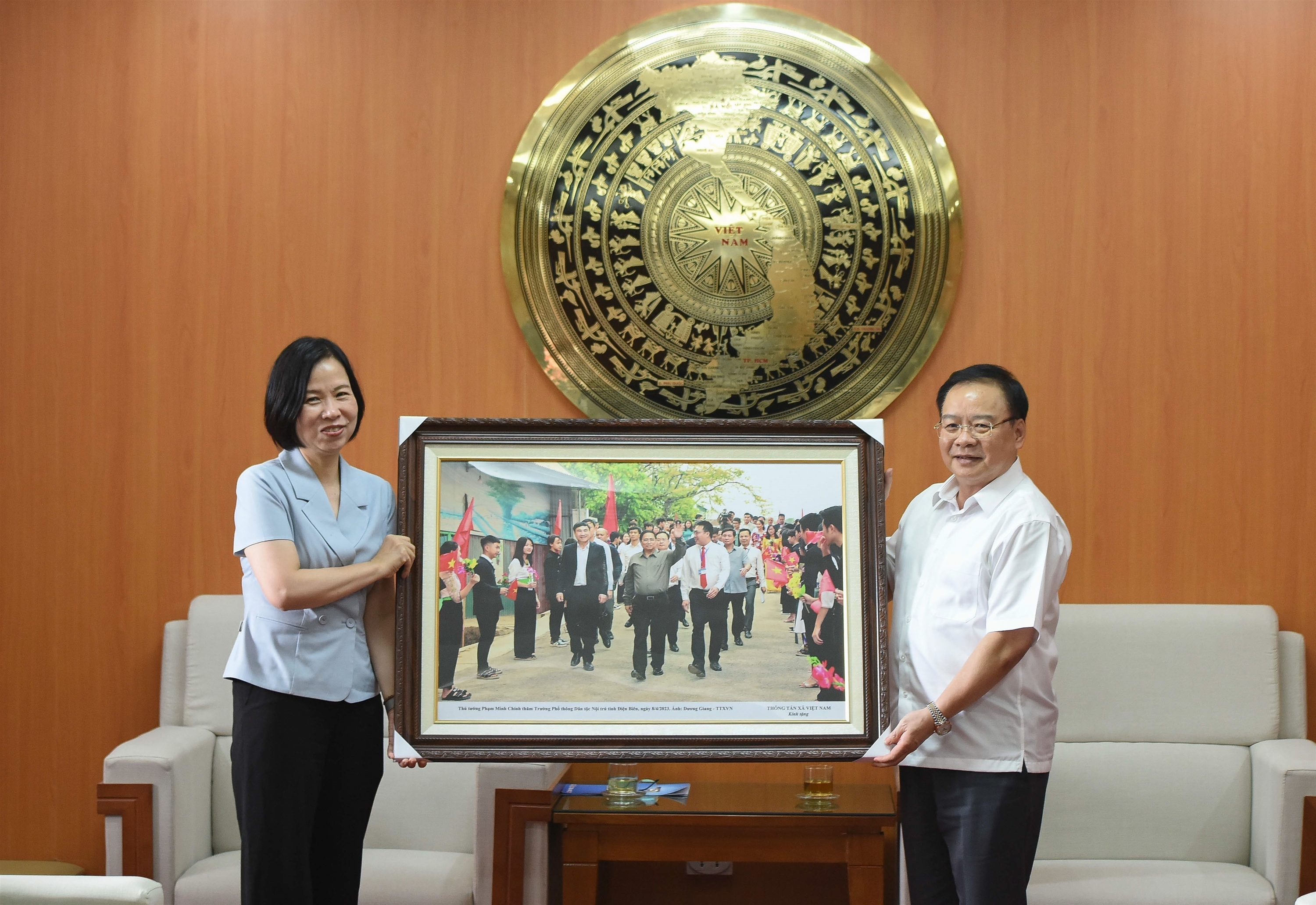 | Tổng giám đốc TTXVN Vũ Việt Trang tặng bức ảnh chụp Thủ tướng Chính phủ Phạm Minh Chính thăm Trường Phổ thông dân tộc nội trú tỉnh Điện Biên tháng 4/2023, do phóng viên TTXVN thực hiện, ngày 30/8 |