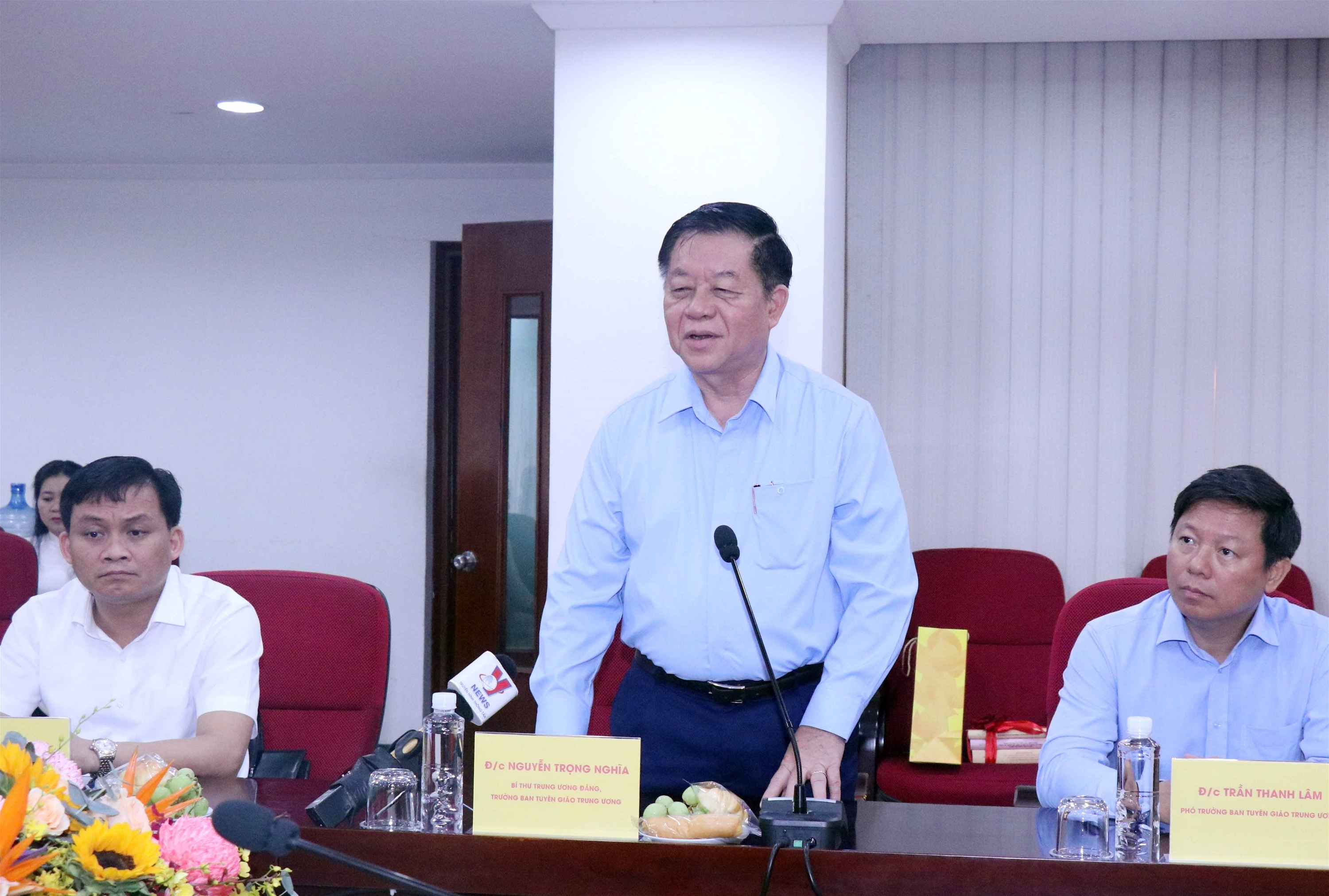 | Bí thư Trung ương Đảng, Trưởng ban Tuyên giáo Trung ương Nguyễn Trọng Nghĩa phát biểu chúc mừng TTXVN nhân kỷ niệm 78 năm thành lập, ngày 6/9 |
