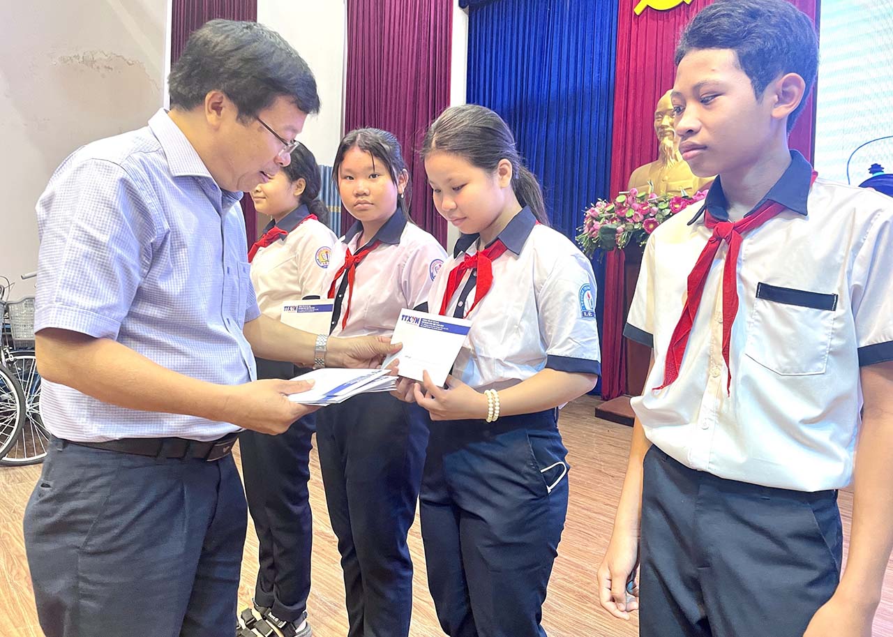 | Phó giám đốc Cơ quan TTXVN khu vực phía Nam Phan Văn Đông trao học bổng tặng các em học sinh có hoàn cảnh khó khăn, vươn lên trong học tập tại huyện Xuân Lộc, tỉnh Đồng Nai, ngày 9/9 |