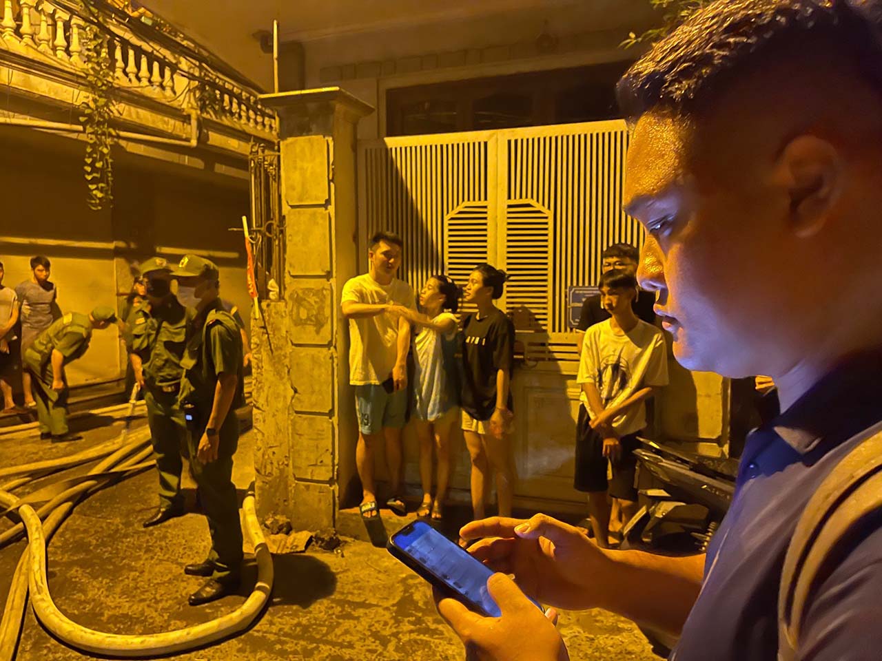 | Phóng viên Phạm Kiên tại hiện trường vụ cháy chung cư mini, phố Khương Hạ, Hà Nội, đêm 13/9 |
