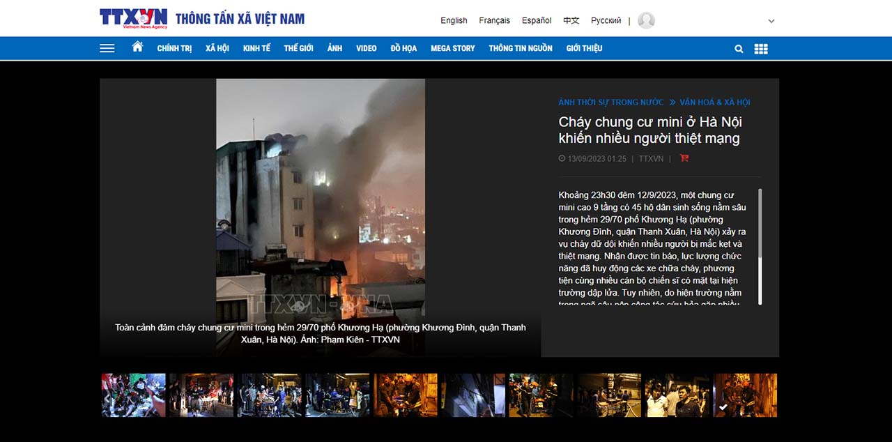 | Những bức ảnh đầu tiên của phóng viên Phạm Kiên về vụ cháy được phát lên cổng thông tin của TTXVN lúc 1 giờ 25 phút, ngày 13/9 |
