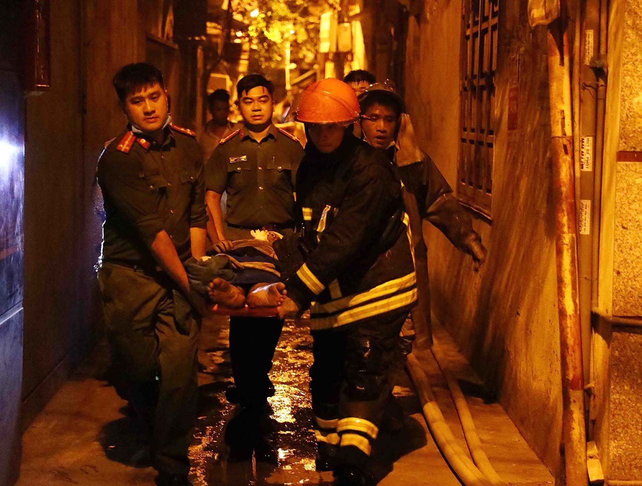 | Lực lượng chức năng khẩn trương đưa nạn nhân ra khỏi hiện trường vụ cháy, ngày 13/9 |