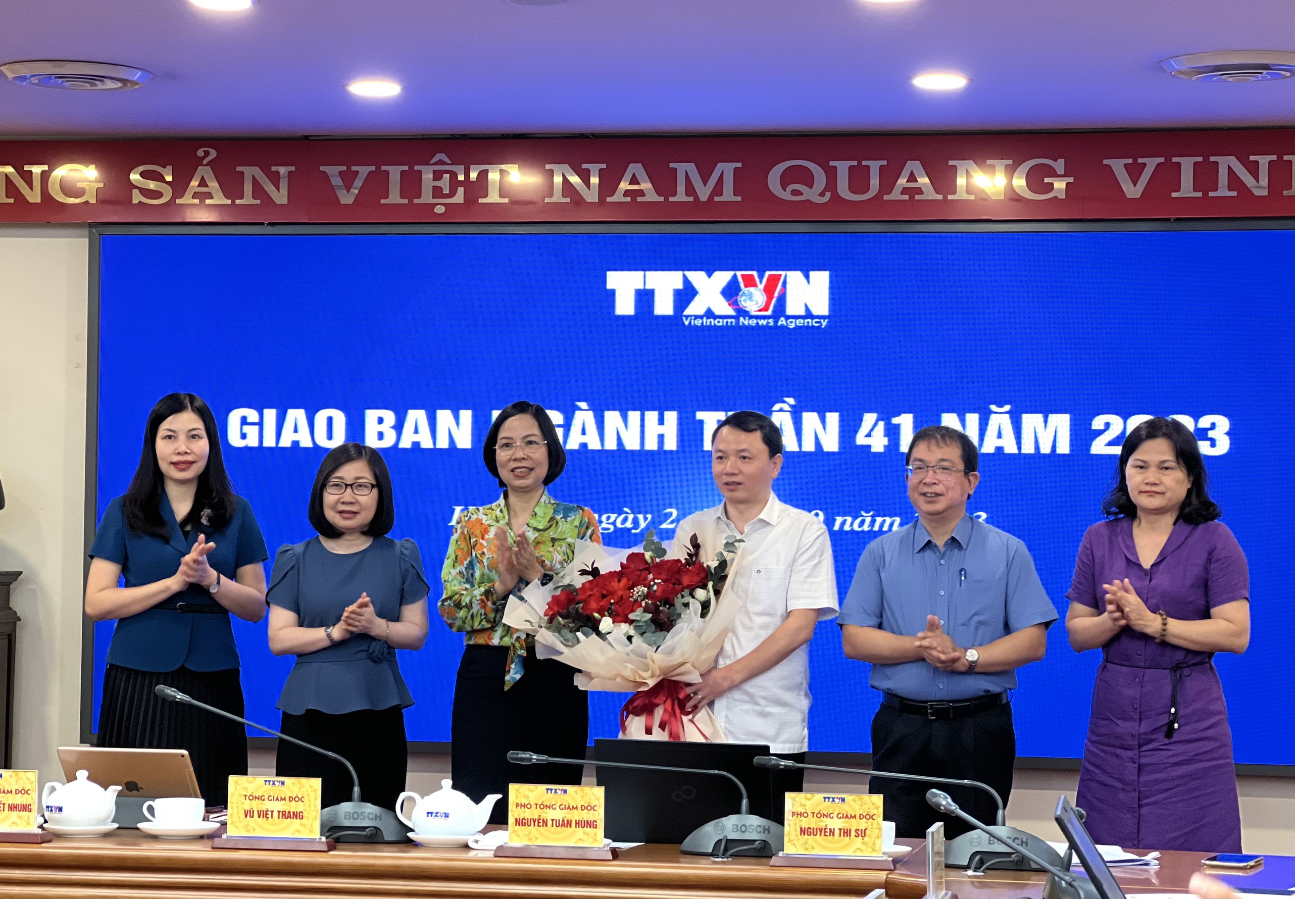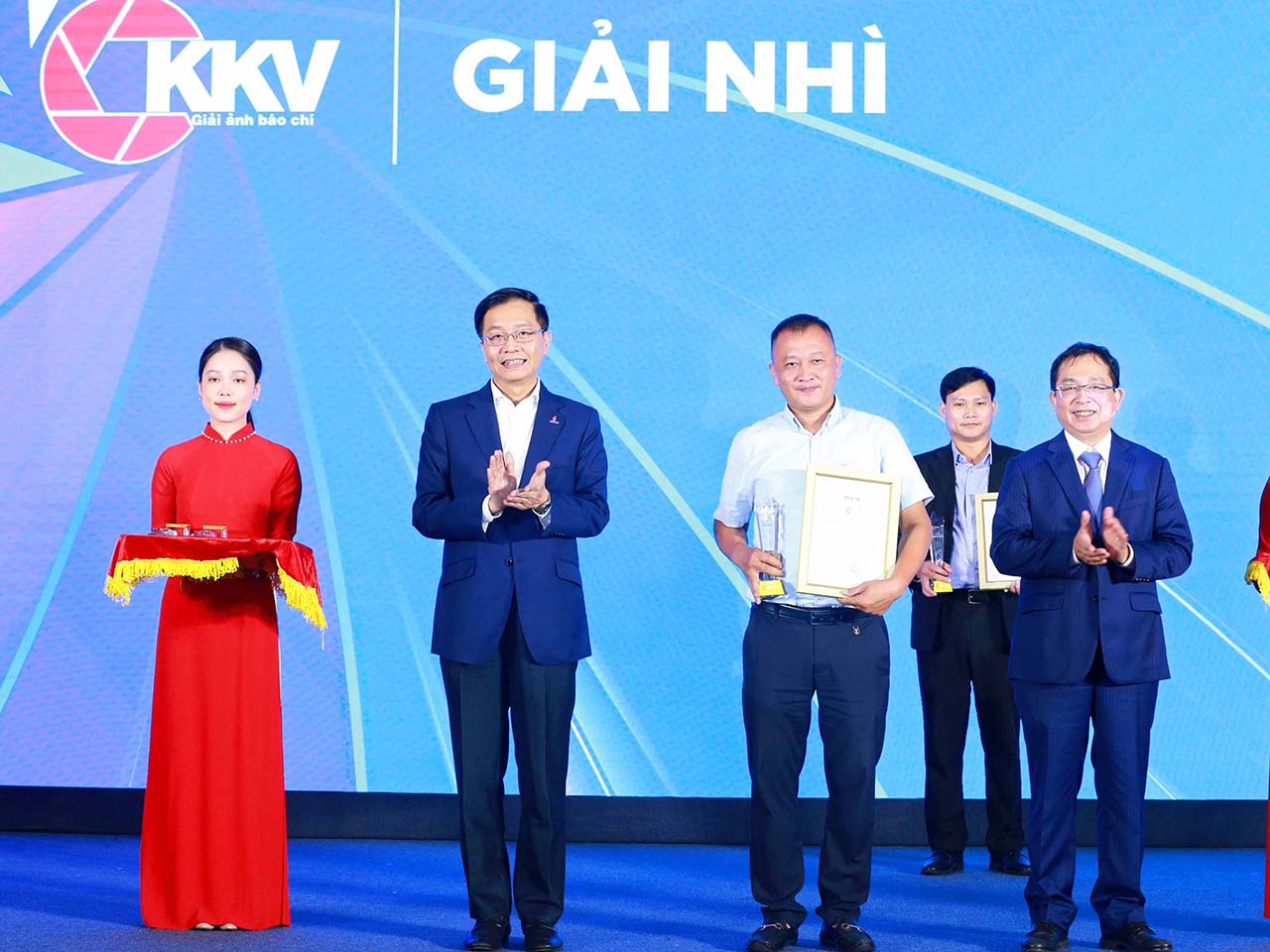 | Phó tổng giám đốc TTXVN Nguyễn Tuấn Hùng và ông Trần Quang Dũng, Ủy viên Ban Thường vụ, Trưởng ban Truyền thông và Văn hóa doanh nghiệp, Tập đoàn Dầu khí Việt Nam trao giải Nhì Giải ảnh báo chí Khoảnh khắc vàng lần thứ 6 cho tác giả Hoàng Thống Nhất, Ban biên tập Ảnh TTXVN |