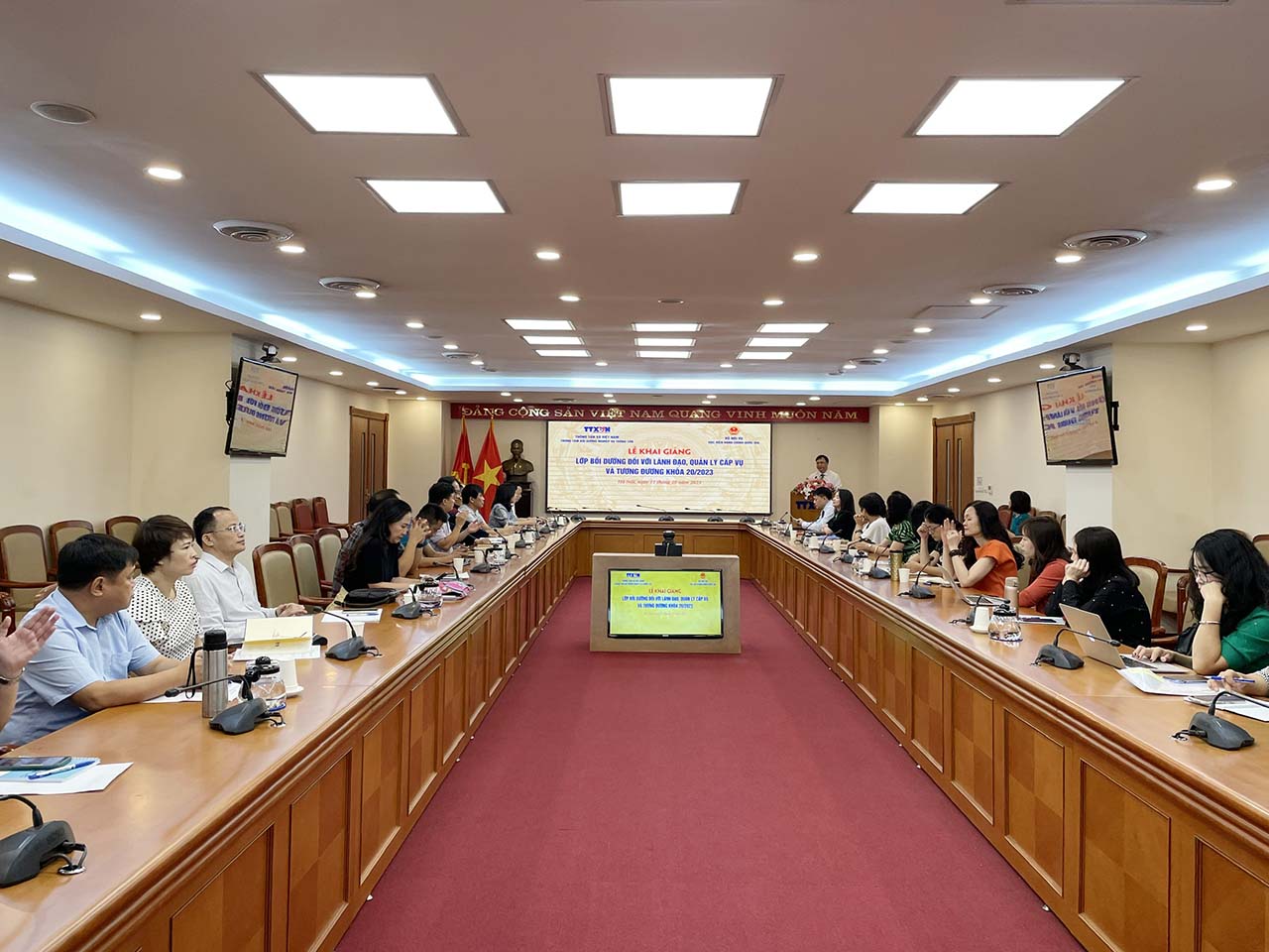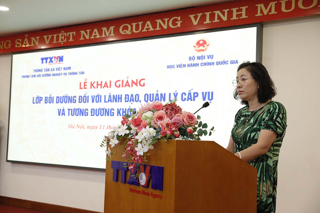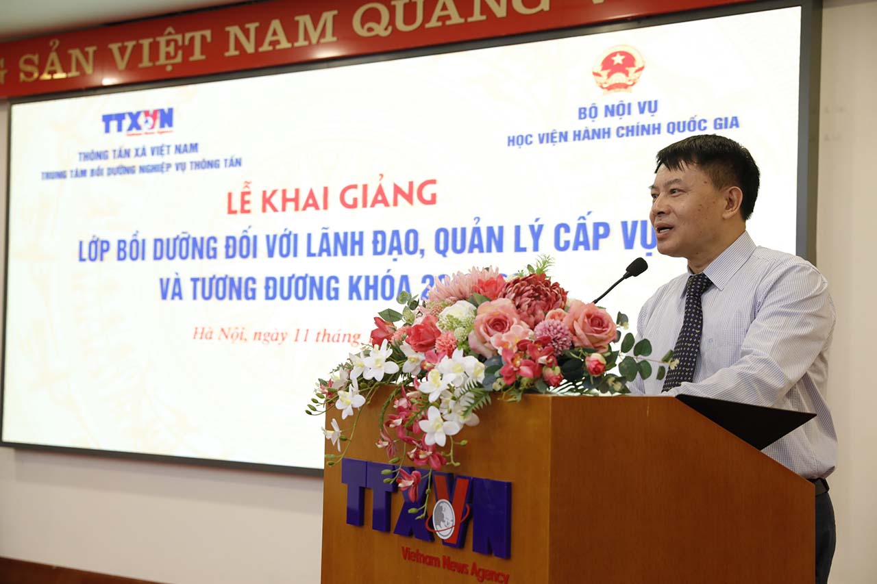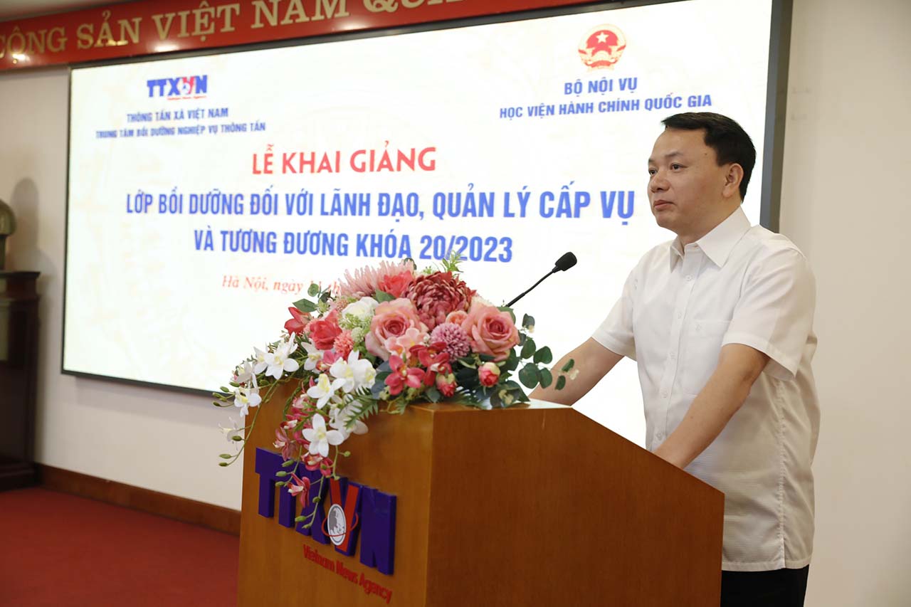 Sáng 11/10, Thông tấn xã Việt Nam (TTXVN) phối hợp với Học viện Hành chính Quốc gia khai giảng lớp bồi dưỡng đối với lãnh đạo, quản lý cấp Vụ và tương đương khóa 20/2023. Đây là khóa học bồi dưỡng lãnh đạo, quản lý cấp Vụ và tương đương đầu tiên được tổ chức tại TTXVN, với sự tham dự của 43 viên chức của TTXVN đang giữ chức vụ lãnh đạo, quản lý cấp Vụ và tương đương và được quy hoạch chức vụ lãnh đạo, quản lý cấp Vụ và tương đương.