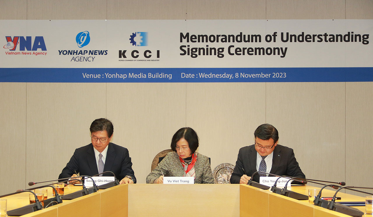 | Tổng giám đốc TTXVN Vũ Việt Trang, Chủ tịch Yonhap Seong Ghi-hong và đại diện Phòng Thương mại và Công nghiệp Hàn Quốc ký Bản ghi nhớ về trách nhiệm xã hội của các doanh nghiệp Hàn Quốc đầu tư tại Việt Nam, ngày 8/11 |