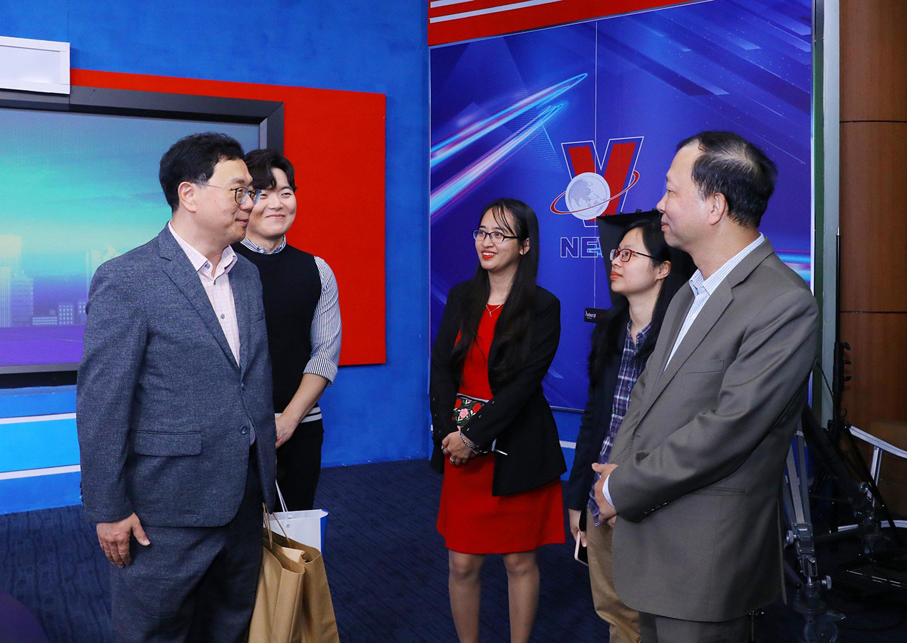 Nhân dịp này, đoàn phóng viên Yonhap đã tham quan và tìm hiểu quy trình sản xuất thông tin tại Trung tâm Truyền hình Thông tấn./.