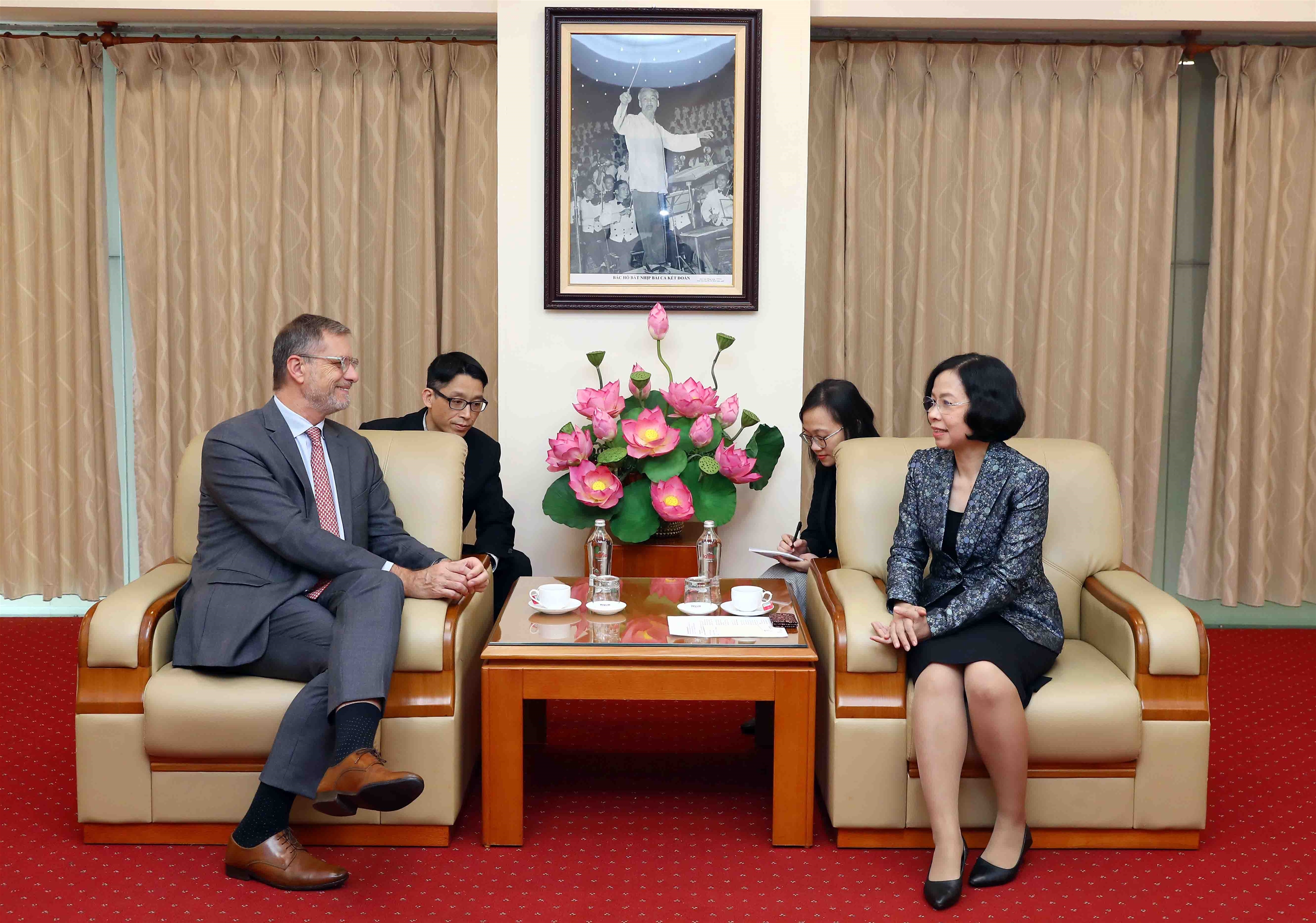 Tại buổi tiếp Đại sứ Pháp Olivier Brochet, Tổng giám đốc Vũ Việt Trang chúc mừng ngài Đại sứ bắt đầu nhiệm kỳ công tác tại Việt Nam vào thời điểm hai nước kỷ niệm 50 năm thiết lập quan hệ ngoại giao và 10 năm quan hệ đối tác chiến lược.