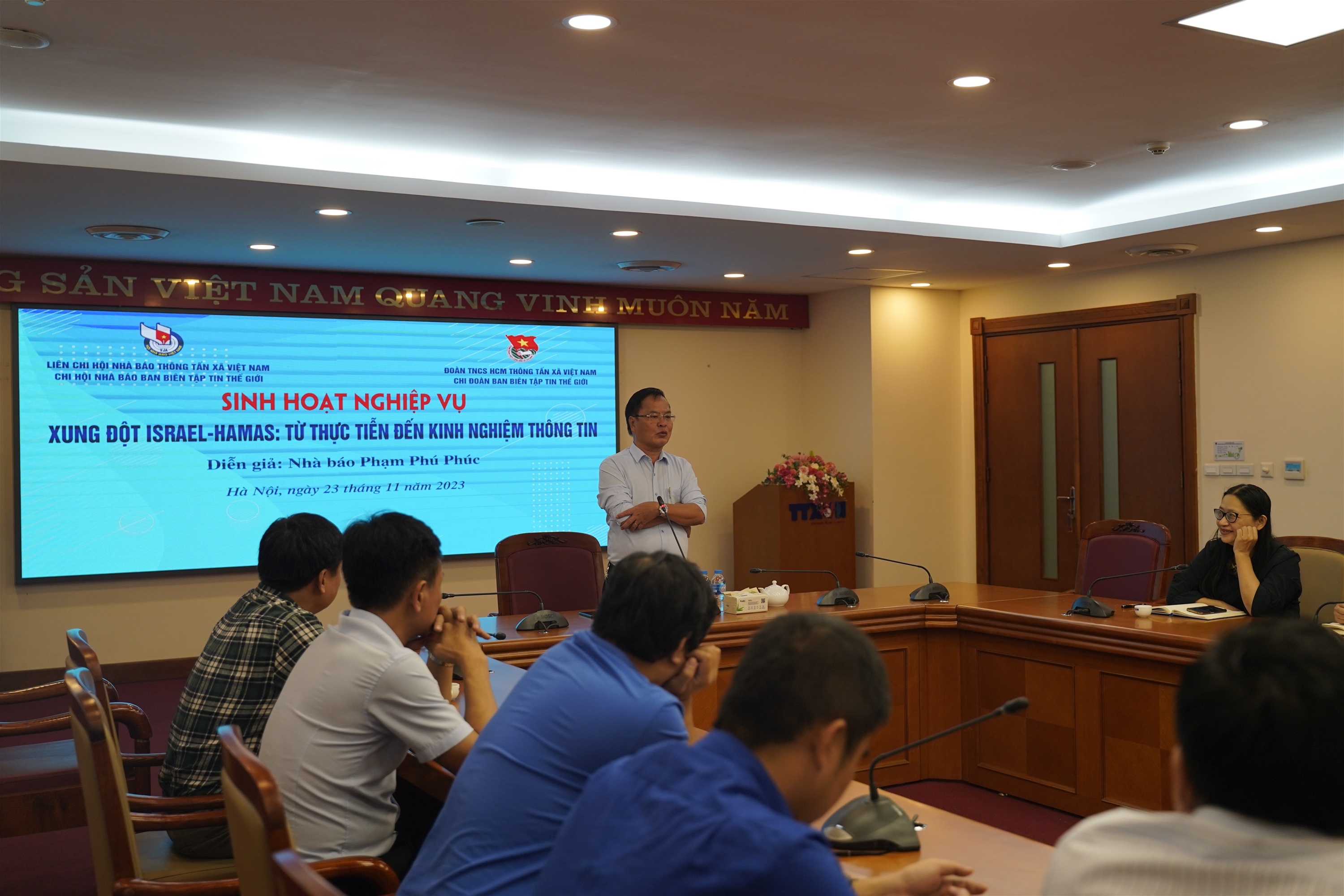 Sự kiện và kỷ niệmTin trong ngành Sinh hoạt nghiệp vụ thông tin quốc tế Thứ sáu, 24/11/2023 20:56 Ngày 23/11, Chi hội Nhà báo và Chi đoàn Ban biên tập tin Thế giới đã tổ chức buổi sinh hoạt nghiệp vụ với chủ đề “Xung đột Israel-Hamas: Từ thực tiễn đến kinh nghiệm thông tin”, nhằm nâng cao kỹ năng đưa tin quốc tế, góp phần định hướng thông tin tại đơn vị. Nhà báo Phạm Phú Phúc, nguyên Phó trưởng ban biên tập tin Thế giới, chia sẻ kinh nghiệm thông tin, tác nghiệp hiện trường, ngày 23/11 Tại buổi sinh hoạt nghiệp vụ, nhà báo Phạm Phú Phúc, nguyên Phó trưởng ban biên tập tin Thế giới, đã chia sẻ nhiều kinh nghiệm thông tin, tác nghiệp hiện trường, đồng thời giải đáp những băn khoăn, vướng mắc của các đồng nghiệp phát sinh trong quá trình sản xuất thông tin. Đây là sự kiện trong chuỗi hoạt động nhằm nâng cao chất lượng công tác chuyên môn, gắn với thực tiễn thông tin các vấn đề thời sự quốc tế được lãnh đạo đơn vị, Chi hội Nhà báo và Chi đoàn Ban biên tập tin Thế giới đẩy mạnh từ đầu năm 2023. Trước đó, tháng 10/2023, Chi hội Nhà báo và Chi đoàn Ban biên tập tin Thế giới đã tổ chức tọa đàm về tình hình Cuba và công tác thông tin tại địa bàn./. Nội san Thông tấn