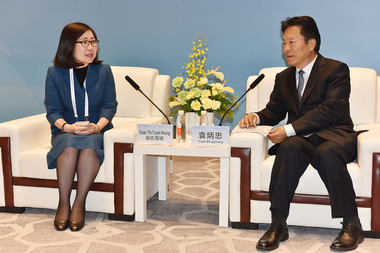 | Phó tổng giám đốc TTXVN Đoàn Thị Tuyết Nhung gặp Phó chủ tịch Tân Hoa xã Viên Bính Trung, ngày 4/12 |
