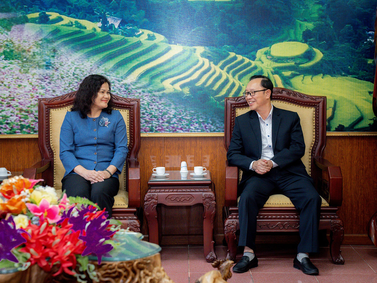 | Phó tổng giám đốc TTXVN Nguyễn Thị Sự và Phó bí thư Thường trực Tỉnh ủy, Chủ tịch HĐND tỉnh Hà Giang Thào Hồng Sơn tại buổi làm việc ngày 15/12 |