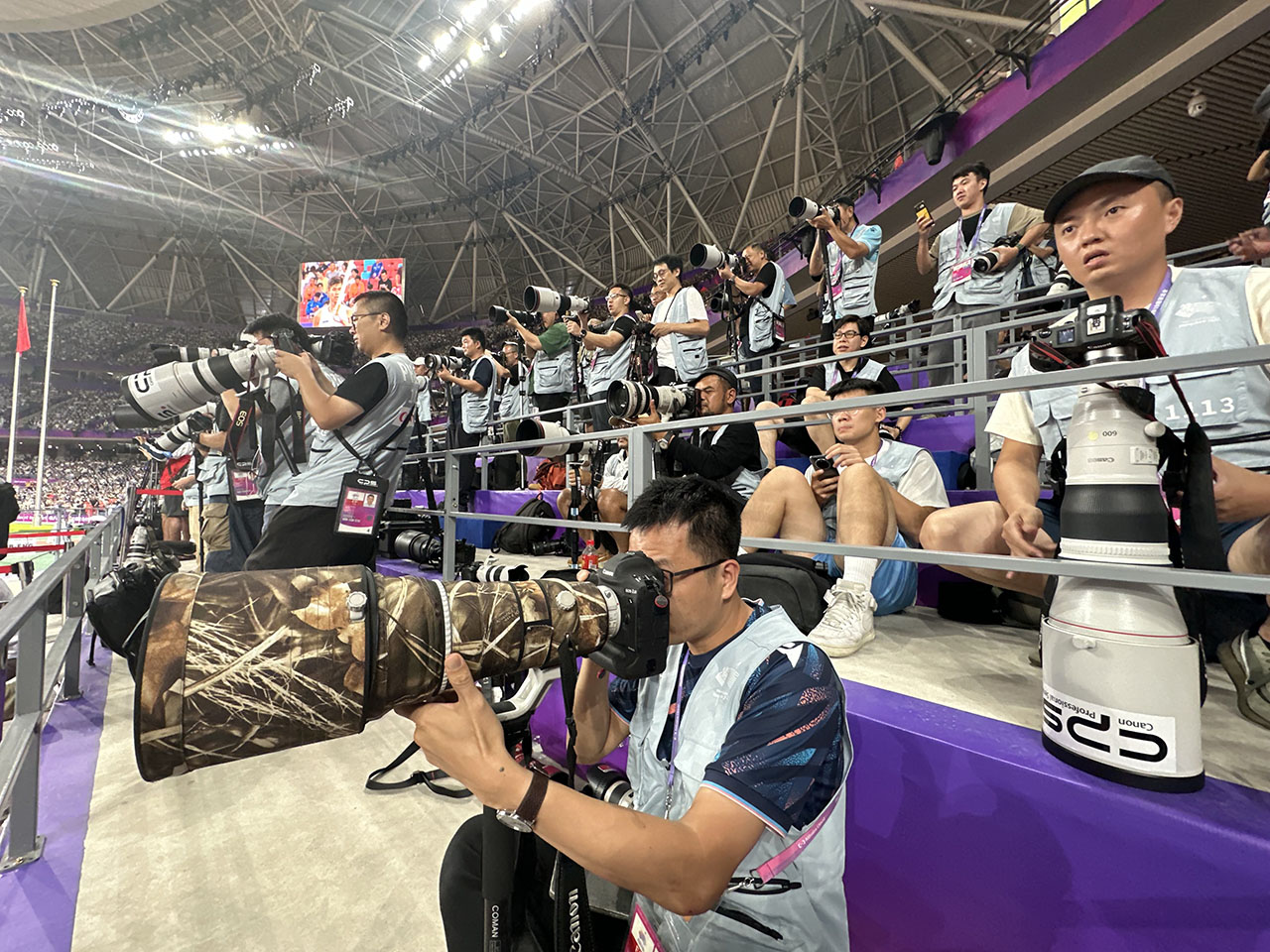 | Phóng viên báo Thể thao và Văn hóa Hoàng Linh cùng các đồng nghiệp chụp ảnh các trận đấu môn điền kinh, ASIAN Games 19, tại sân vận động Olympic Hàng Châu, Trung Quốc, tháng 10/2023 |