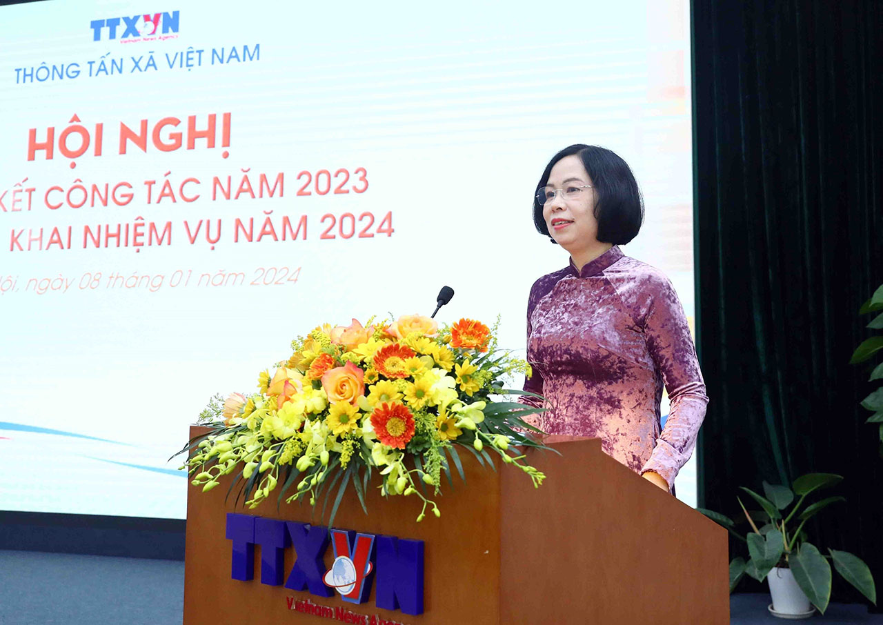 Phát biểu chỉ đạo hội nghị, Bí thư Đảng ủy, Tổng giám đốc TTXVN Vũ Việt Trang nhấn mạnh, năm 2024, các đơn vị cần đổi mới hơn nữa quy trình xử lý, đăng tải thông tin, đảm bảo thông tin nhanh, chuẩn xác, ngắn gọn, hấp dẫn; bám sát các nghị quyết, văn bản chỉ đạo cũng như thực tiễn cuộc sống để tạo ra những tác phẩm báo chí đích thực. Tổ chức tốt các tuyến thông tin bảo vệ nền tảng tư tưởng của Đảng, các bài viết phản hồi, phản bác để ổn định dư luận, tạo sự đồng thuận trong xã hội; đẩy mạnh tuyến thông tin dự báo tình hình, tham chiếu kinh nghiệm của các nước. Các đơn vị thông tin đối ngoại, quốc tế đối nội và Cơ quan thường trú (CQTT) ngoài nước thực hiện hiệu quả Kết luận của Bộ Chính trị về tiếp tục nâng cao chất lượng, hiệu quả công tác thông tin đối ngoại trong tình hình mới.