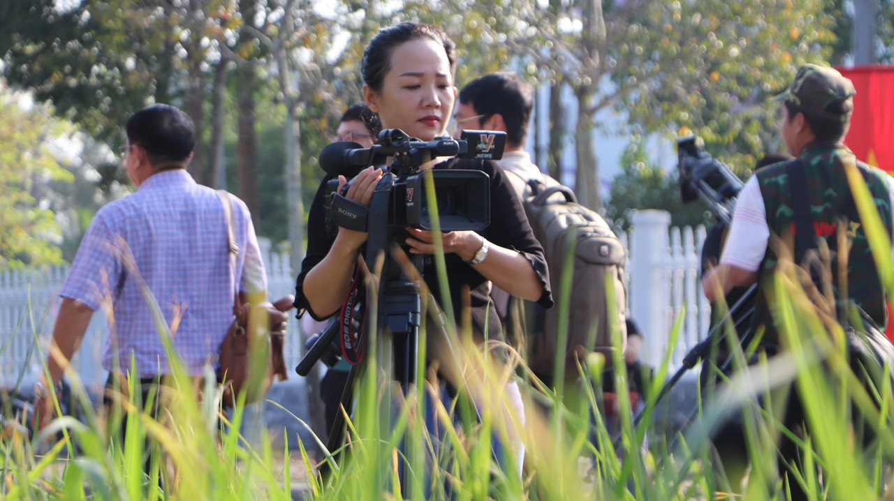 | Phóng viên CQTT TTXVN tại Hậu Giang Nguyễn Thị Thúy Hằng ghi hình tại Festival quốc tế ngành hàng lúa gạo Việt Nam, tháng 12/2023 |
