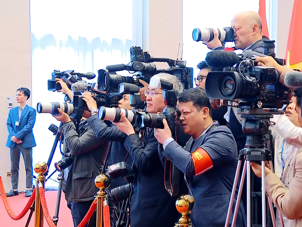 | Phóng viên TTXVN cùng các đồng nghiệp tác nghiệp trong Lễ đón Tổng Bí thư, Chủ tịch nước Trung Quốc tại Phủ Chủ tịch, tháng 12/2023 |
