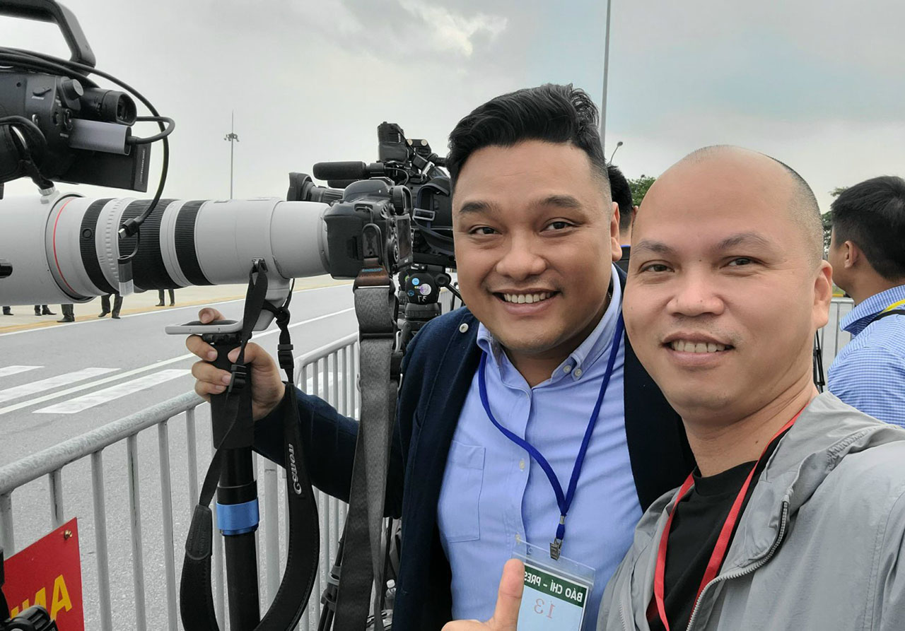 | Phóng viên Ban biên tập Ảnh TTXVN Phạm Kiên cùng đồng nghiệp trong lễ tiễn Tổng Bí thư, Chủ tịch nước Trung Quốc tại sân bay Nội Bài, Hà Nội, tháng 12/2023 |