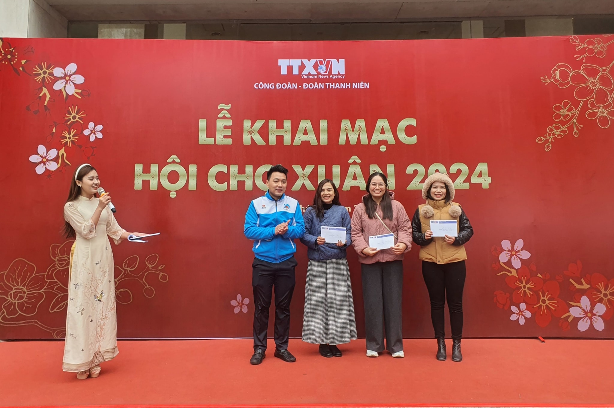 | Tổng giám đốc TTXVN Vũ Việt Trang, Phó tổng giám đốc Nguyễn Tuấn Hùng cùng các đại biểu cắt băng khai mạc Hội chợ Xuân 2024, ngày 26/1 |