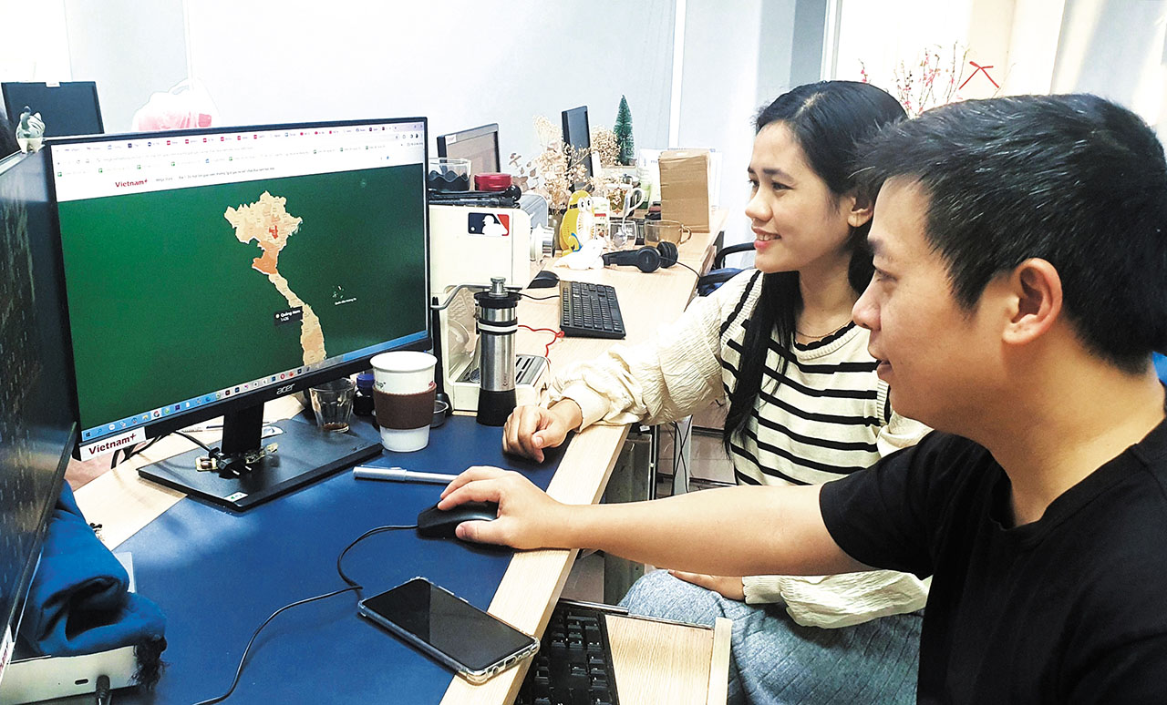 | Phóng viên Phạm Mai và Phó trưởng phòng Biên tập Võ Hoàng Long, báo điện tử VietnamPlus, thảo luận phương án dựng infographic cho tác phẩm “Thiếu giáo viên khắp cả nước, ngành giáo dục chật vật đổi mới”, tháng 9/2023 |