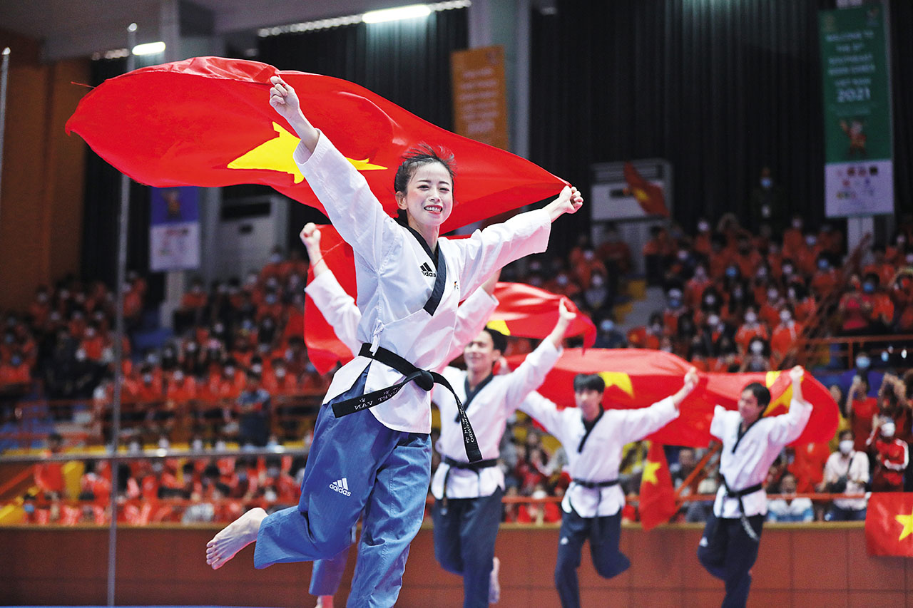 Trái với môn bóng đá nam, môn Taekwondo được tổ chức trong Nhà thi đấu quận Tây Hồ (Hà Nội), từ ngày 16-19/5/2022. Chiều 16/5, ngay trong trận mở màn, đội tuyển Taekwondo Việt Nam đã xuất sắc giành huy chương Vàng ở nội dung biểu diễn quyền sáng tạo đồng đội. Tôi may mắn chọn được vị trí đẹp và nhanh chóng “chớp” được hình ảnh vận động viên Châu Tuyết Vân cùng các đồng đội: Hứa Văn Huy, Nguyễn Ngọc Minh Hy, Trần Đăng Khoa và Nguyễn Thị Lệ Kim ăn mừng chiến thắng giành huy chương Vàng ngay trong trận đầu ra quân. Khi ấy, theo phản xạ, tôi giơ máy lên bấm liên tiếp hình ảnh các vận động viên đang chạy, cùng nhau nâng cao lá cờ Tổ quốc. Thời điểm đó, tất cả mọi người có mặt ở Nhà thi đấu Tây Hồ cùng vỡ òa trong niềm vui chiến thắng. Bức ảnh của tôi nhanh chóng được chuyển về Tổng xã và được duyệt phát, chuyển tải tới công chúng trong nước và quốc tế niềm hạnh phúc của các vận động viên, các cổ động viên và vị thế của thể thao Việt Nam.
