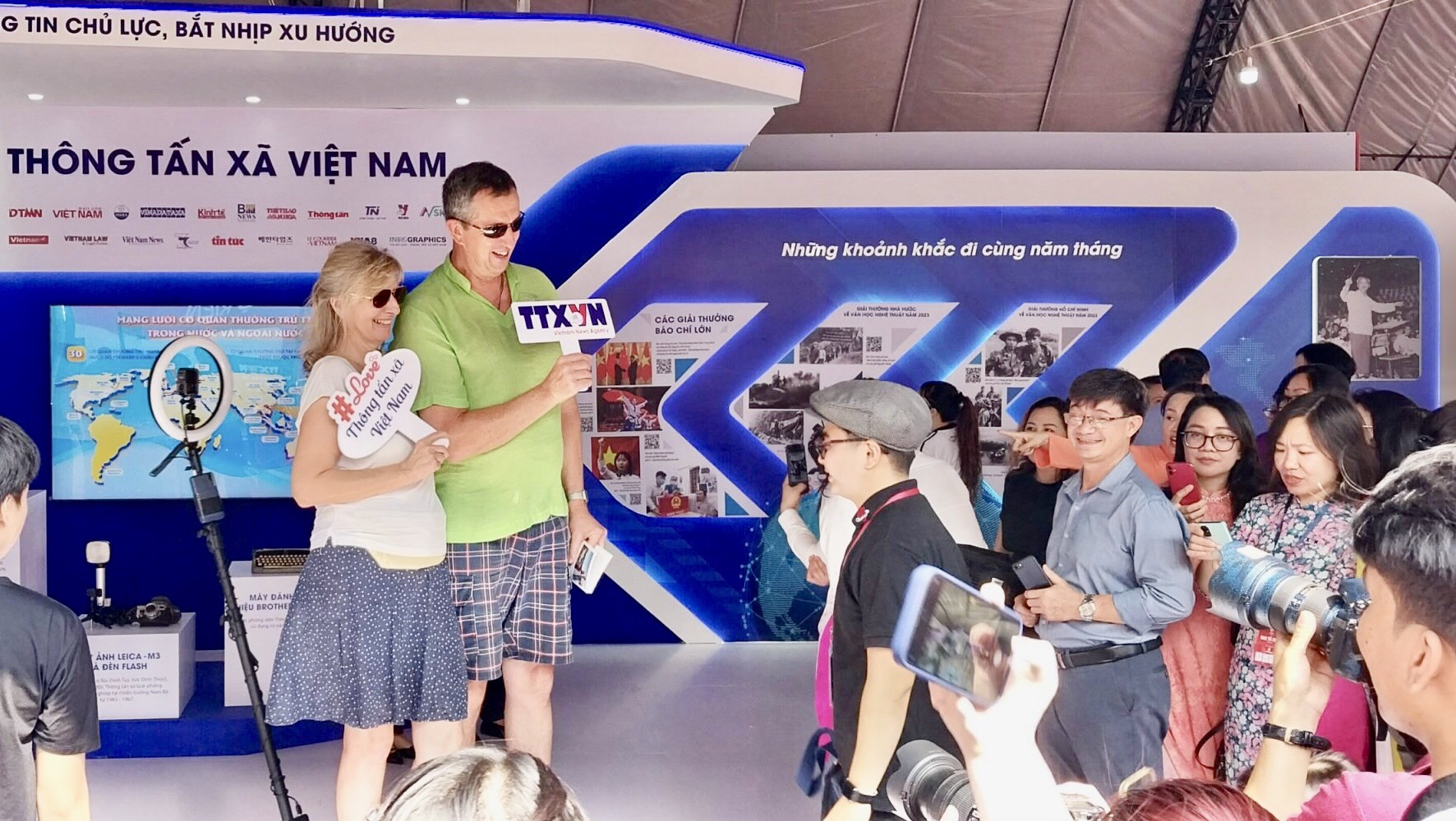 | Rất đông khách trong nước và quốc tế đến tham quan và check-in tại gian trưng bày của TTXVN tại Hội Báo toàn quốc 2024, ngày 15/3 |