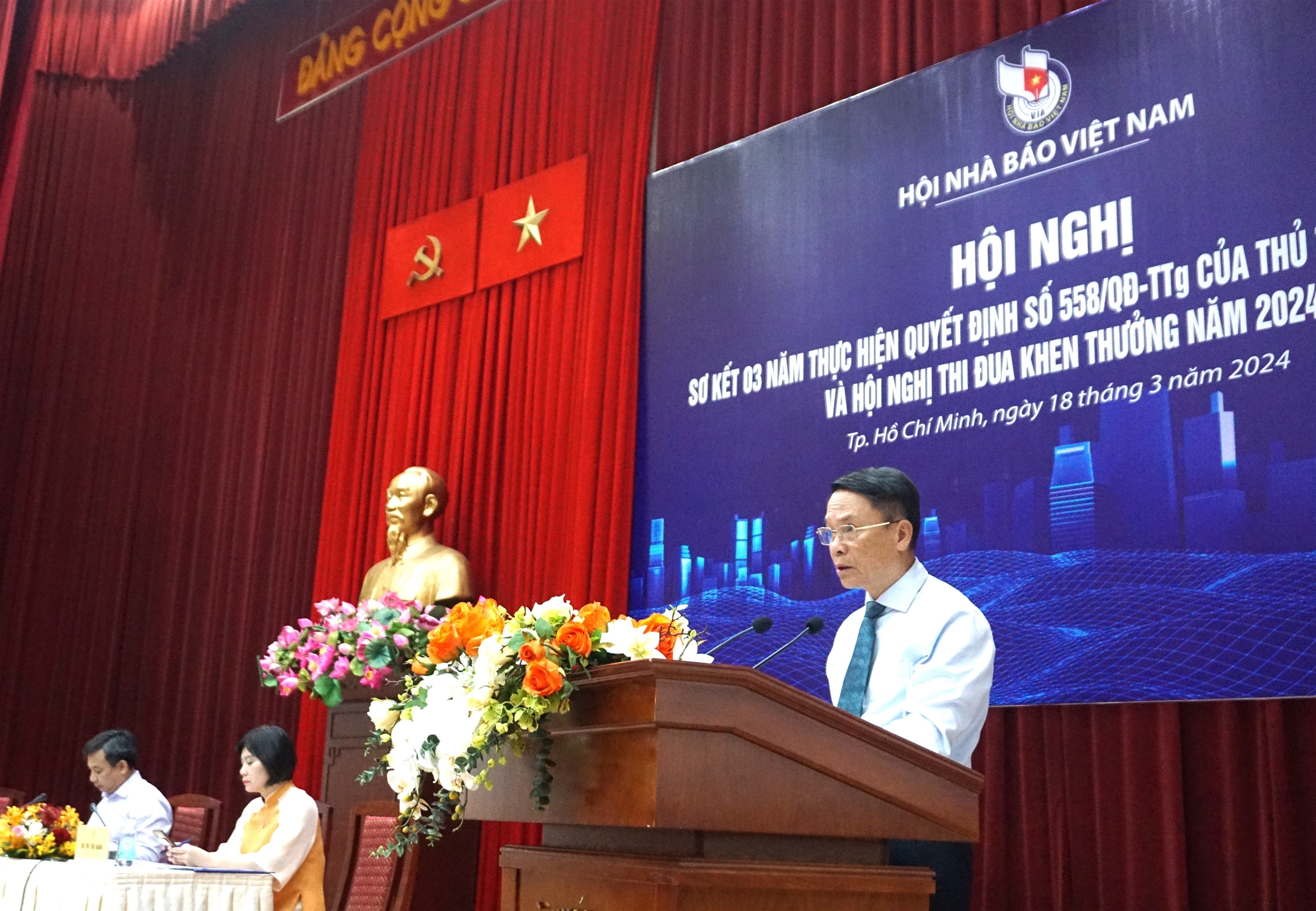 | Phó Chủ tịch Thường trực Hội Nhà báo Việt Nam Nguyễn Đức Lợi phát biểu tại Hội nghị sơ kết 3 năm thực hiện Quyết định số 558/QĐ-TTg của Thủ tướng Chính phủ và Hội nghị thi đua khen thưởng năm 2024 của Hội Nhà báo Việt Nam, ngày 18/3 |