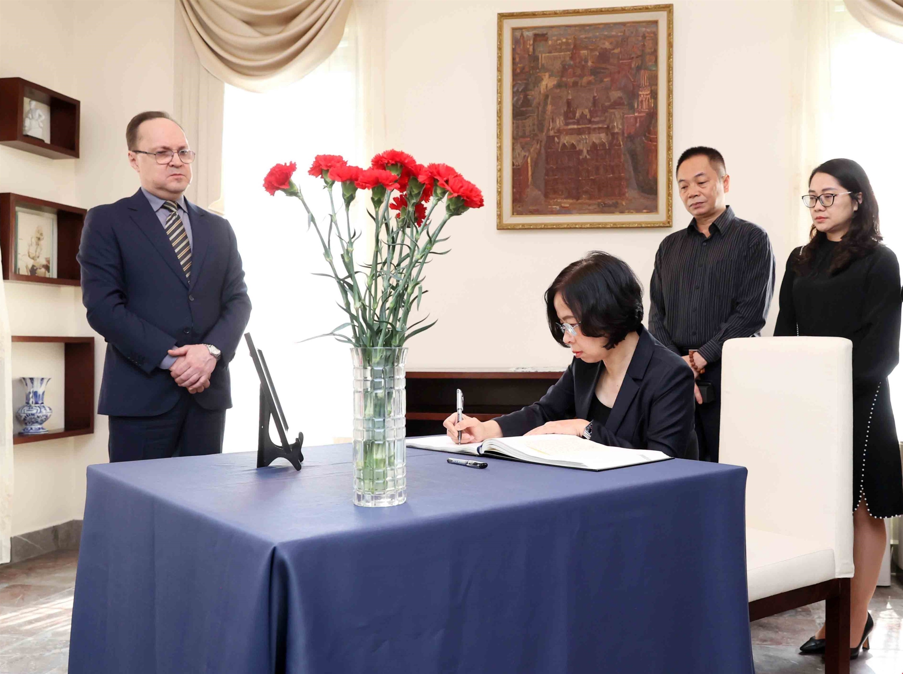 Sự kiện và kỷ niệmTin trong ngành Tổng giám đốc TTXVN tưởng niệm các nạn nhân vụ khủng bố tại Moskva (Liên bang Nga) Thứ ba, 26/03/2024 16:47 Sáng 26/3, Bí thư Đảng uỷ, Tổng giám đốc Thông tấn xã Việt Nam (TTXVN) Vũ Việt Trang dẫn đầu đoàn đại biểu TTXVN đến Đại sứ quán Liên bang Nga tại Hà Nội, viếng và ghi sổ tang, tưởng niệm các nạn nhân thiệt mạng trong vụ tấn công khủng bố tại Trung tâm thương mại Crocus, Moskva tối 22/3/2024 (giờ địa phương)./. Tổng giám đốc TTXVN Vũ Việt Trang ghi sổ tang, tưởng niệm các nạn nhân thiệt mạng trong vụ tấn công khủng bố tại Trung tâm thương mại Crocus, Moskva, ngày 26/3 TTXVN/Nội san Thông tấn