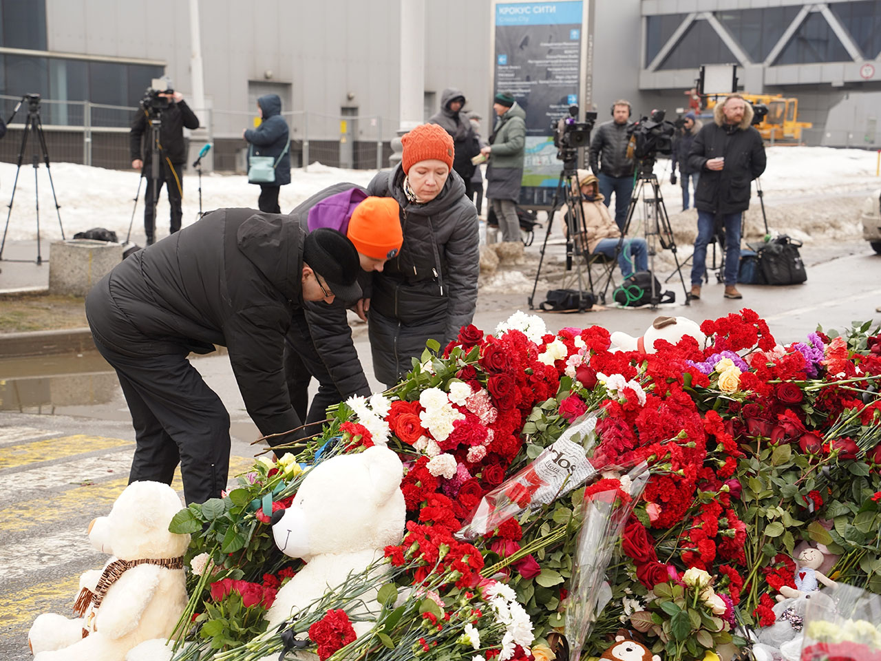 | Dòng người không dứt tới đặt hoa tưởng niệm các nạn nhân thiệt mạng trong vụ tấn công khủng bố tối 22/3 tại nhà hát Crocus City Hall |