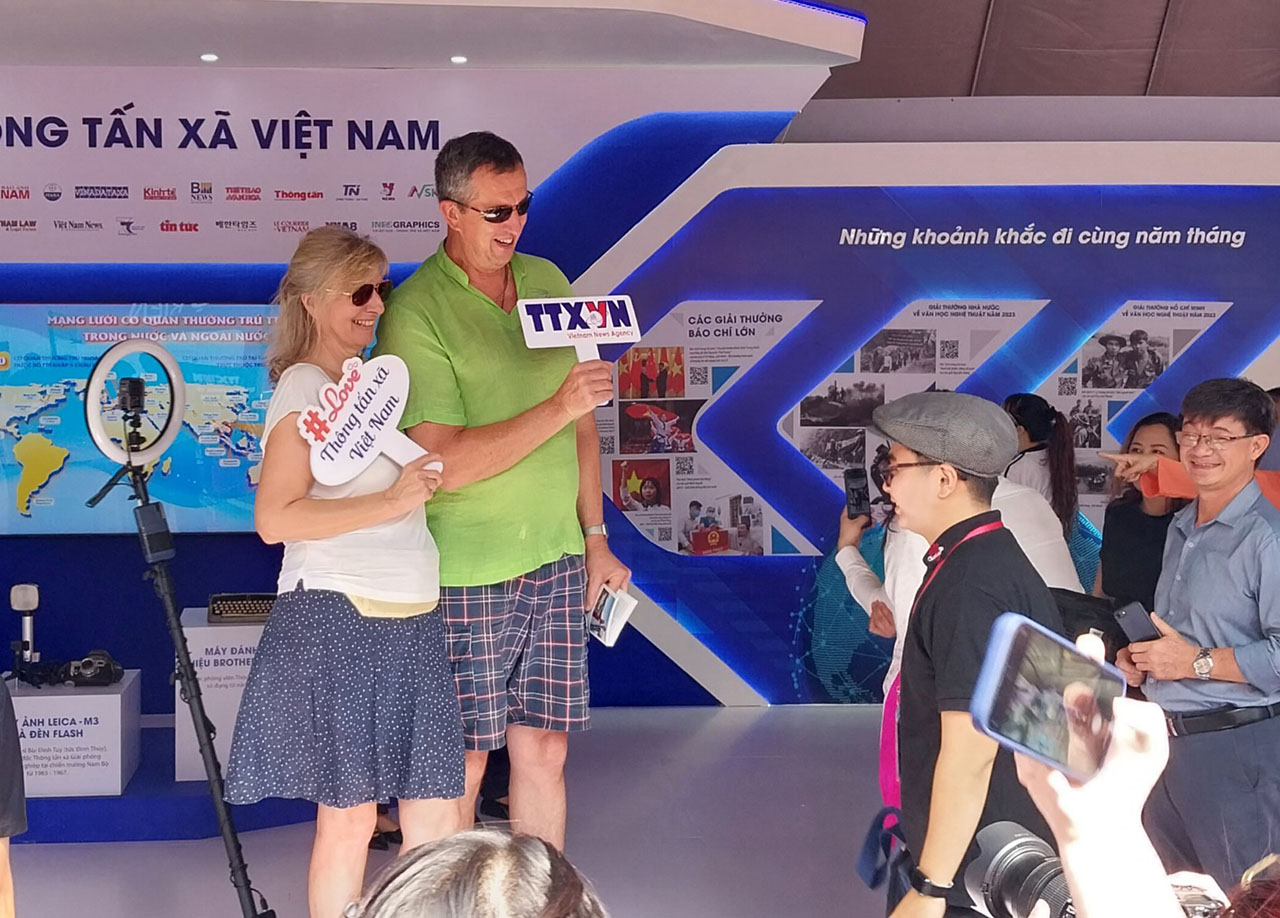 Rất đông khách trong nước và quốc tế đến tham quan và check-in tại gian trưng bày của TTXVN tại Hội Báo toàn quốc 2024, ngày 15/3