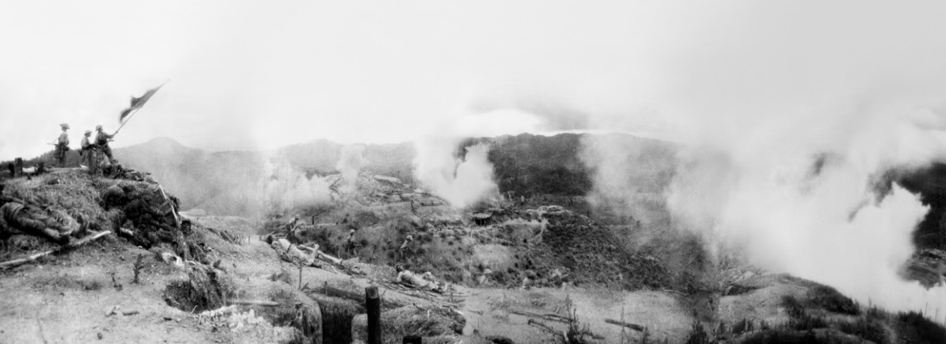 Ảnh 2: Toàn cảnh chiến thắng Him Lam, chụp trực tiếp, nối ghép bằng hai phim quét ngang. Máy ảnh năm đó còn thô sơ, không thể chụp toàn cảnh (panorama), khi đứng gần đối tượng bằng một lần bấm máy. Bấm máy hai lần thu được toàn cảnh khu vực trận địa, ghép không lệch... đấy là sự sáng tạo của nhà nhiếp ảnh tài ba gặp khó về kỹ thuật, nhưng lại may mắn chớp được khoảnh khắc có một không hai.