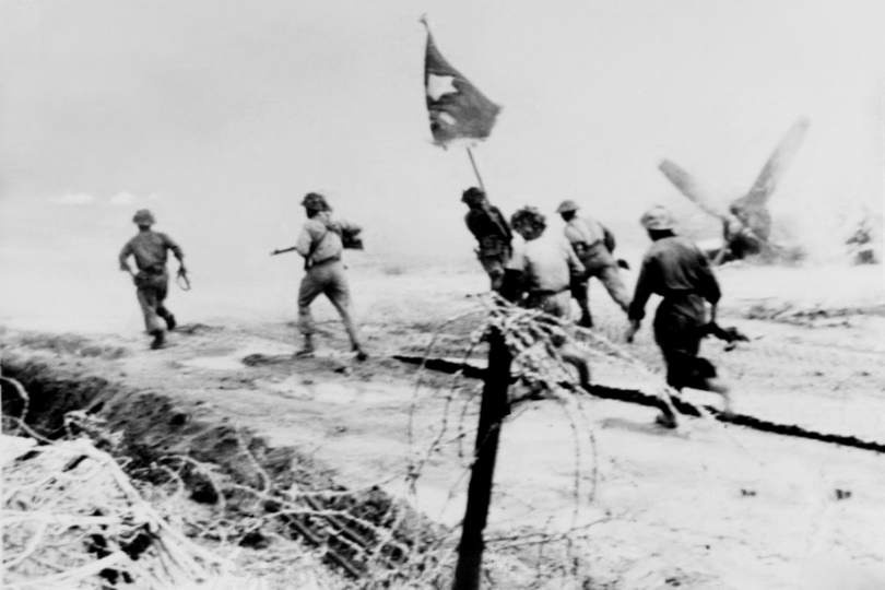 Phất cờ trên nóc hầm De Casteris. Đây là chặng đường tiến bước của lá cờ từ ngày 13/3 đến ngày 7/5/1954. Cờ đi đến đâu, quân Pháp đổ rạp tới đó. Đúng là ngọn cờ thiêng của Tổ Quốc!