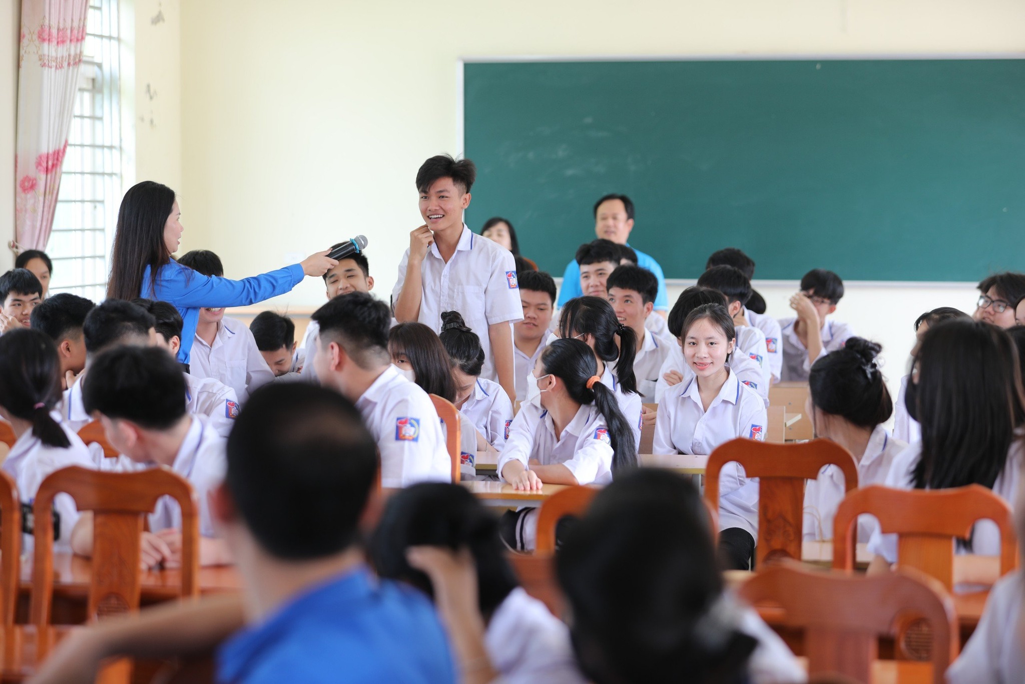 | Các em học sinh Trung tâm Giáo dục nghề nghiệp - Giáo dục thường xuyên huyện Thanh Thuỷ, tỉnh Phú Thọ hào hứng đặt câu hỏi tại chương trình "Nói không với fake news và kỹ năng sử dụng mạng xã hội an toàn, hiệu quả” của Đoàn thanh niên TTXVN, ngày 10/5 |